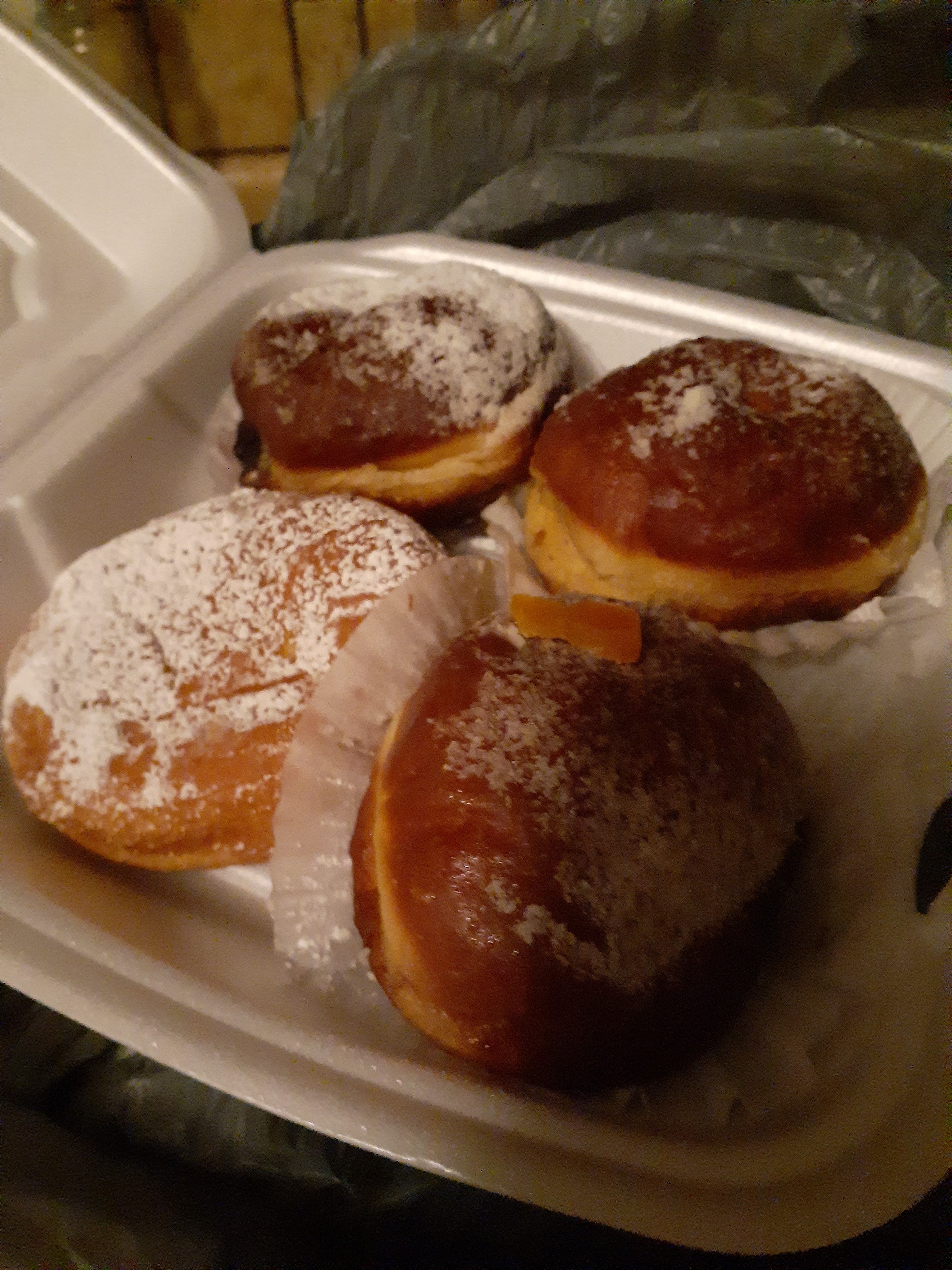call them Berliner. The jelly doughnuts happened because people would clear their kitchens of milk and butter in preparation for Lent and would make doughnuts. The paczki dough recipe is similar to German, Jewish, and Italian filled doughnuts, but traditional paczki contain a splash of Polish vodka called Spiritus in addition to the flour, eggs, milk, sugar, yeast, and sometimes butter that make up the dough. We hit two Polish and two Italian bakeries on our crawl.