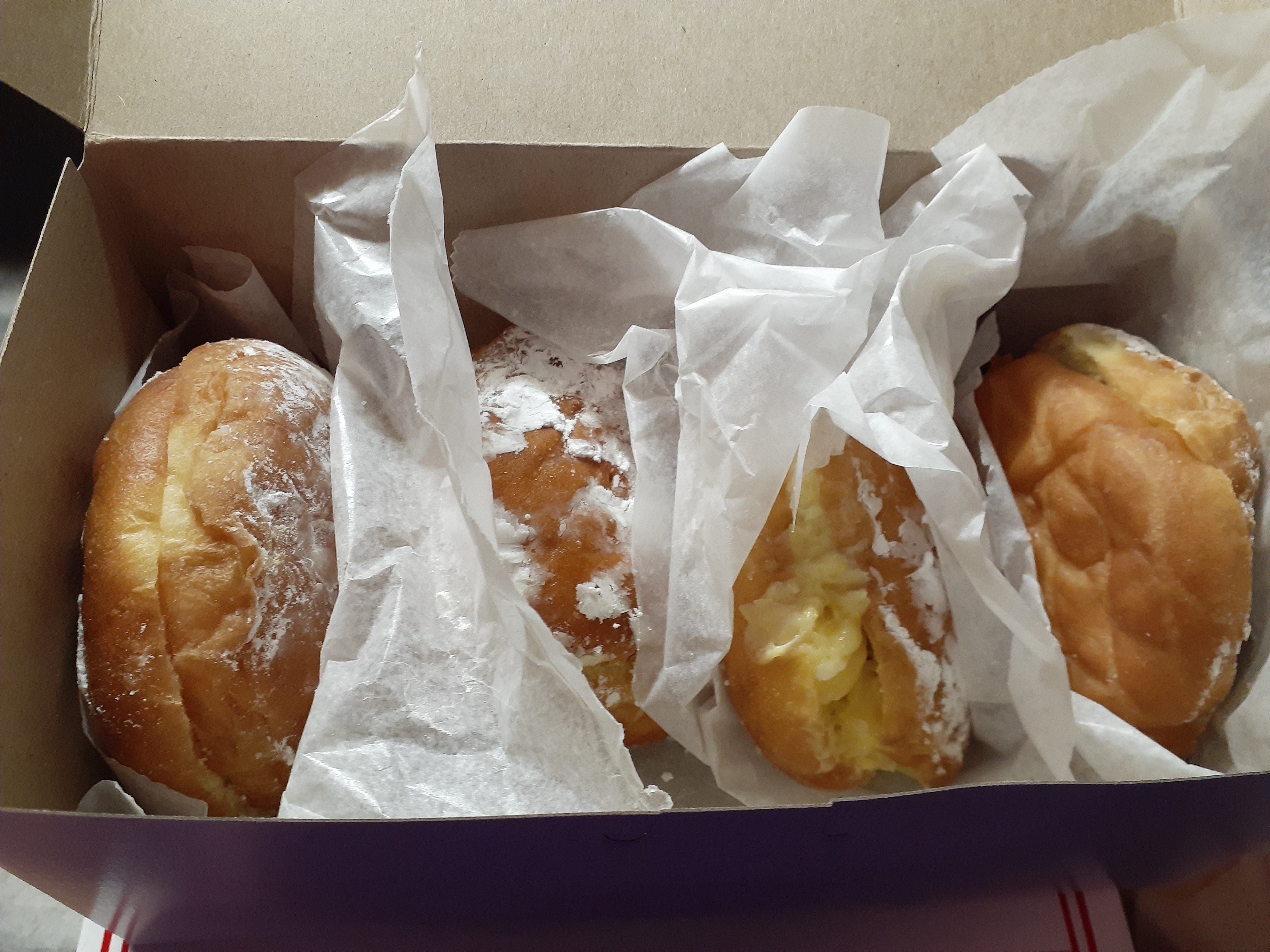 line was almost out the door and got even longer once we got closer to the register. My friend had lamented that she needed coffee, and Michael Angelo’s has a great selection. She bought a breakfast blend, and they were able to grind it for her, which made her happy. I purchased three paczki – a custard, a peanut butter and an apricot. I’ve not seen the peanut butter there before, so I am curious how it is. I love Michael Angelo’s paczki – the dough is soft and I love sinking my teeth into the dough that is stuffed with delicious filling. My friend had ordered a paczki and had to wait