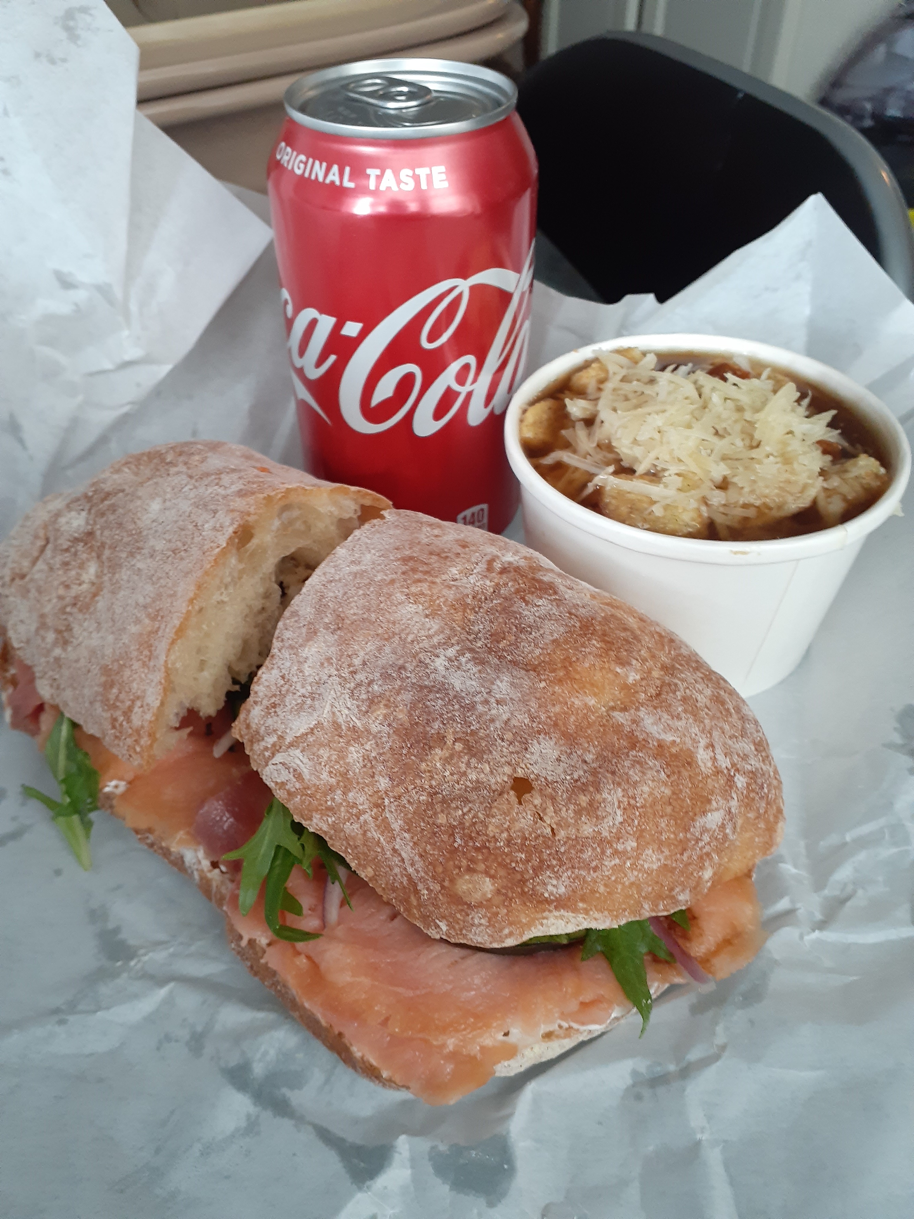 My most recent lunch featured the aforementioned French onion soup and The Alaskan. The Alaskan features smoked salmon, cream cheese, cucumber, red onions and a vinaigrette on a ciabatta bun. I’m not the biggest fan of ciabatta, so I would probably order a different bread choice next time. I always try the default before switching it up.