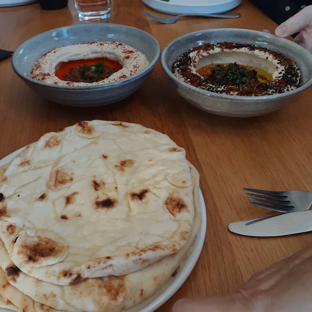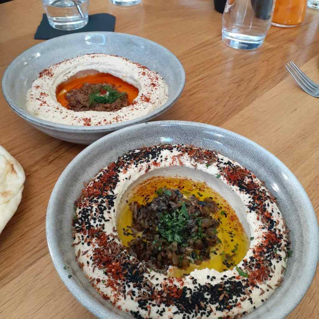 Zhug is also known for its hummus. It serves two kinds of hummus – curried lamb and apricot hummus and nigella seed and burnt onion hummus. I chose the curried lamb and apricot for my first venture and loved it. The hummus is creamy, the curried lamb was fork-tender and I loved the pairing of lamb and apricot. When I met some girlfriends at zhug when things opened up this spring we ordered both. I still preferred the lamb and apricot hummus, but the nigella seed and burnt onion hummus was also a very interesting choice and some of my girlfriends preferred it over the lamb hummus.