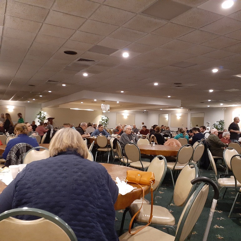 The buffet was set up so that the soup and salad were off to the side and the buffet was in the middle with serving spoons on either side. The dessert and coffee and the bar were along the inside wall on the same wall as the soup and salad station. I grabbed a couple mixed color beans, skipped the tater tots (which were a huge hit with the kids at my table later), took some cabbage and noodles, mac n cheese, and pierogi, and then grabbed some fried fish. The baked fish also looked quite nice, but I try to stick to fried fish at fish fries.
