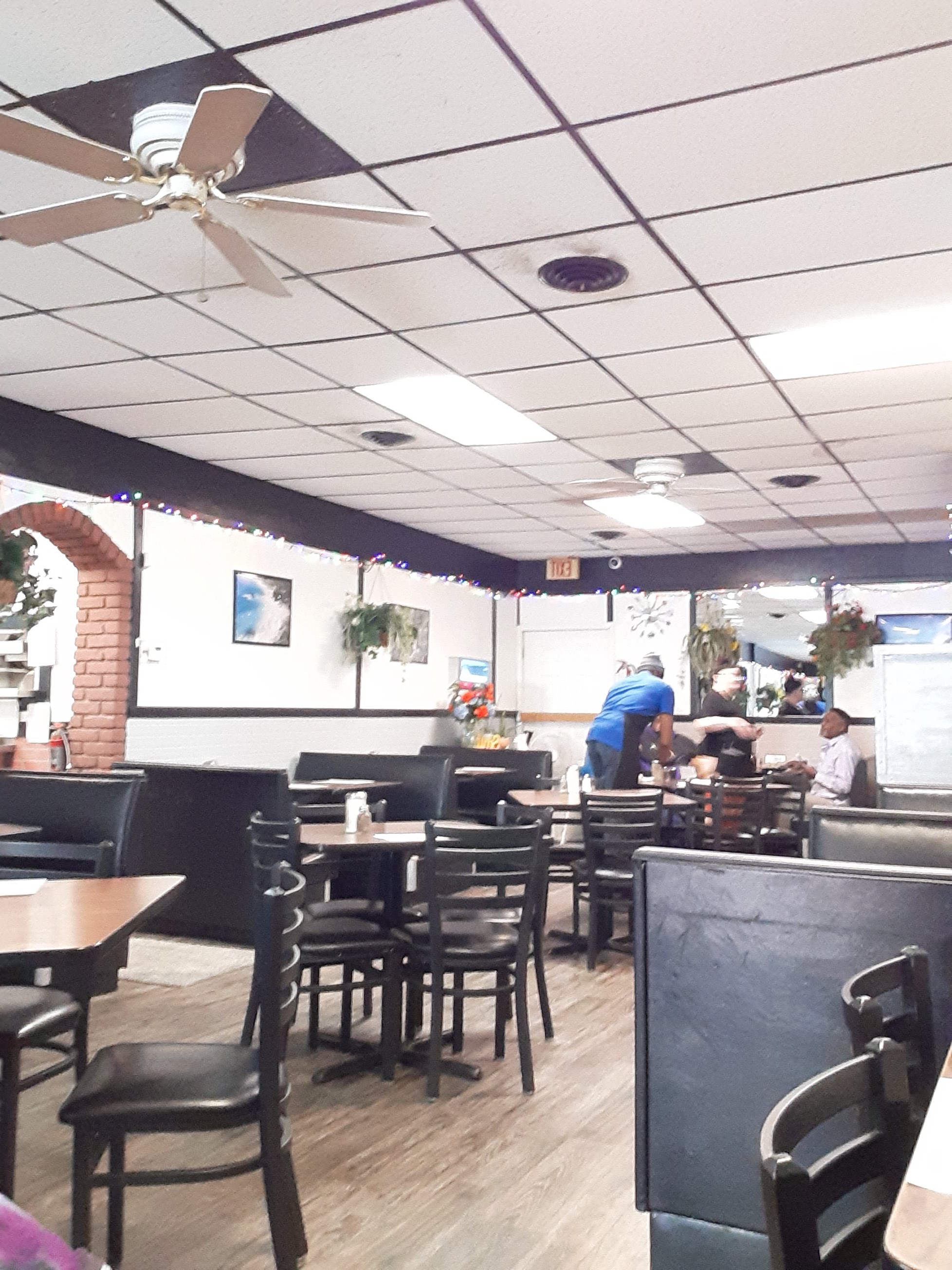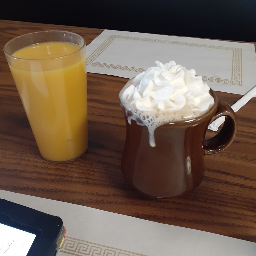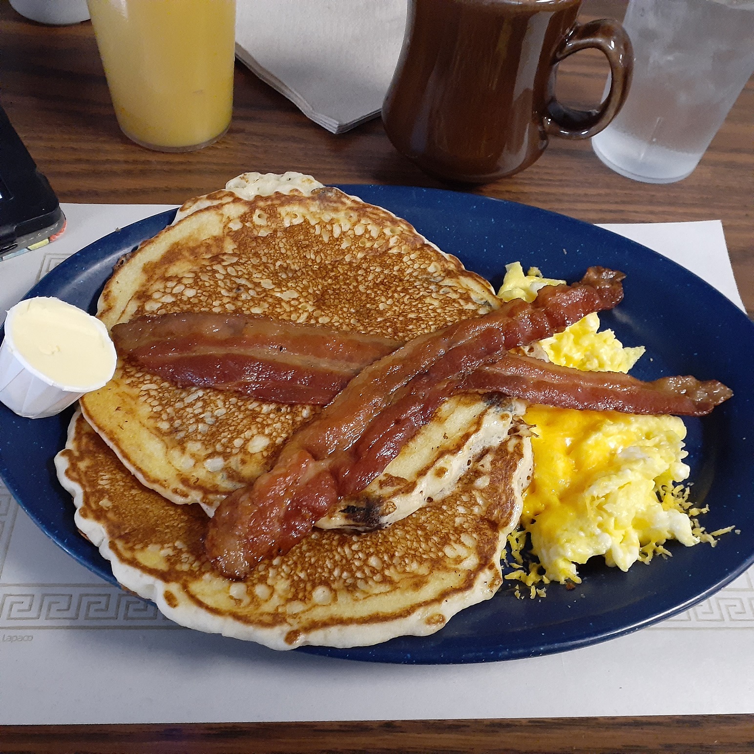 Obviously, the first thing I do when I enter a new place is to ask the waitress what are the most popular items. Her response was “the Hungry Man, the Crazy Omelette, and the Fisherman’s Platter.” Since I wasn’t hungry enough for the Hungry Man (three eggs any style, three hotcakes or three slices of french toast, three slices of bacon, and three sausage links), I decided to order “Two eggs any style,” which comes with a short stack of pancakes or two slices of French toast and two slices of bacon, ham or sausage. I decided to go for scrambled eggs, bacon and upgraded the pancakes to blueberry pancakes. It certainly hit the spot. The blueberry pancakes contained a good amount of blueberries, and the scrambled eggs came out topped with cheese, which was a nice surprise. That was a lot of food for only $6. I splurged on a cappuccino and orange juice. The cappuccino was definitely from a packet, but they both hit the spot.