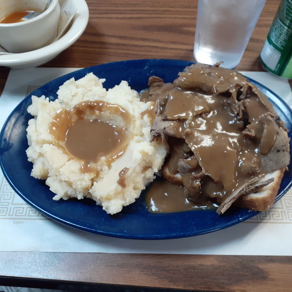 On my third visit, I wasn’t sure if I wanted breakfast or lunch, but decided the siren call of a hot open-faced roast beef sandwich was too tempting to ignore. It isn’t as good as Jack’s Deli’s open-faced brisket, but it is a good roast beef sandwich. I’m not sure what I think of the mashed potatoes. I don’t think they were real mashers. But the sandwich and mashed potatoes hit the Comfort spot.