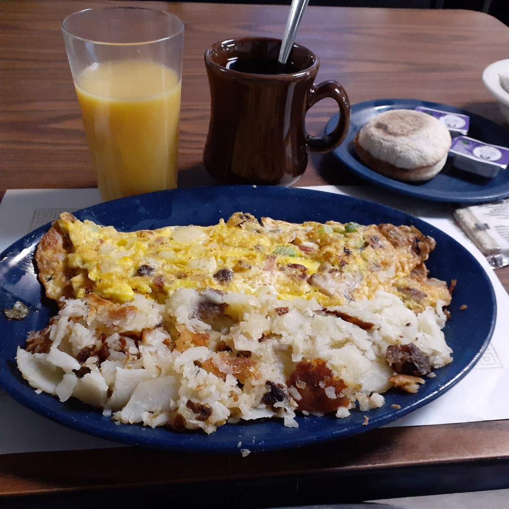 The Crazy Omelette was actually a bit much. I arrived there starving, having looked forward to ordering a Shipwreck at Lucky’s but not wanting/being able to stand and wait 30 minutes, and I got full after eating half of it. The Crazy Omelette contains onions, green peppers, mushrooms, ham, bacon, sausage & cheese. I ordered the home fries and an English muffin. When they say there is an “upcharge” they mean they will charge you for the entire cost of the English muffin or cinnamon swirl toast, so order a normal toast (white, wheat or rye) and then order the English muffin or whatever as a side.