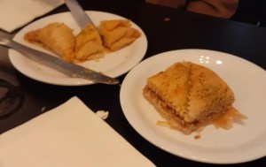 Another friend ordered several of the phyllo dough desserts for us to share. Both the baklava and the sweet goulash (turnover) featured honey and pistachios, but the sweet goulash also had a nice sweet custard and English cream filling. I particularly enjoyed the sweet goulash. I tried to order it the next time I visited for dinner, but they had run out of it.