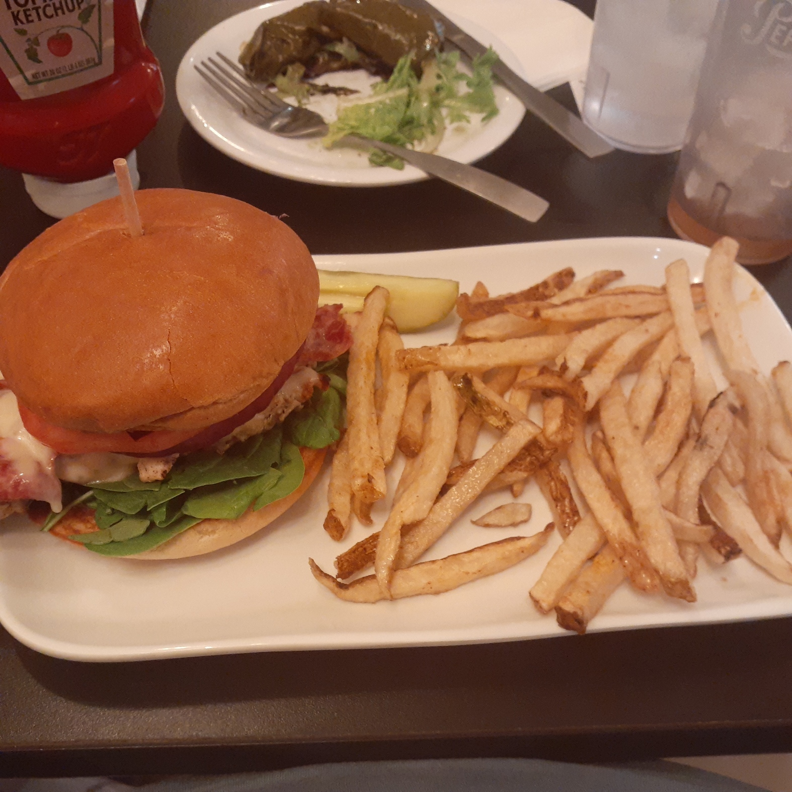 I have also ordered the California Chicken sandwich, which is a grilled chicken breast topped with avocado, bacon, Swiss, spinach, onion, and tomato on a grilled brioche roll. The onion was thick rings of red onion that were very pungent. A little red onion goes a long way. It got better once I removed most of the onion and broke it into tiny pieces that I distributed over the lettuce. They must have been out of avocado that night, but it took me a while to realize it, so I didn’t miss it much. It was a very flavorful sandwich. The spinach, onion, and tomato were very fresh. The bacon was tasty but looked a little weird. Turns out it is turkey bacon. The fresh-cut fries were a nice side, and I enjoyed them.