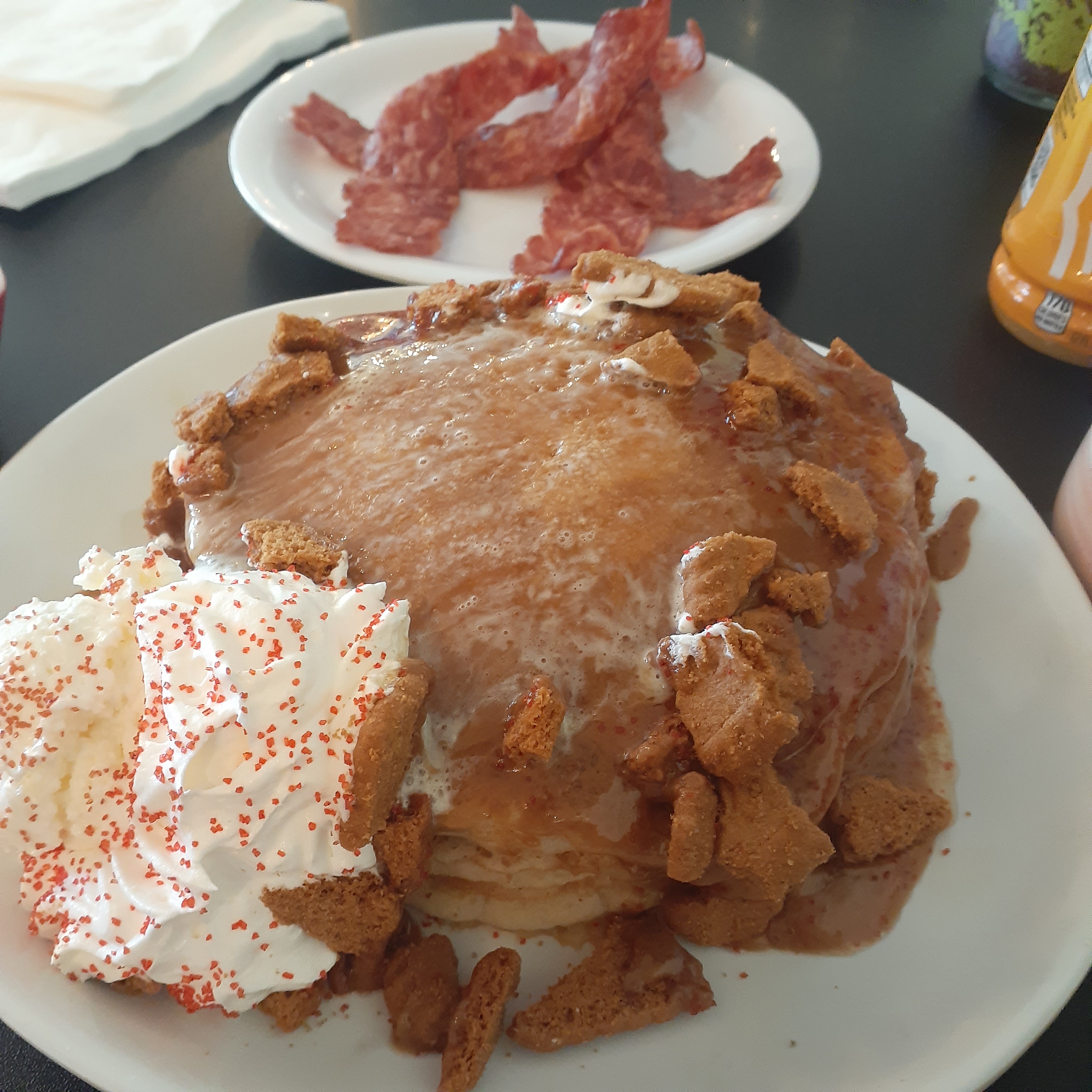 They also serve great pancakes. My friend who returned for the mousakka ordered the chocolate chip pancakes to go and loved them so much he ordered them again. I’m intrigued by the Lotus Dream Pancakes, which are layered and drizzled with Biscoff cookie butter and topped with Biscoff cookie crumbles, red sanding sugar, and fresh whipped cream. If you love cookie butter, you will love these pancakes. The server asked if I wanted syrup, but they were perfect with just the cookie butter. I had forgotten how weird the bacon is. I ordered it to cut the sweetness of the pancakes.