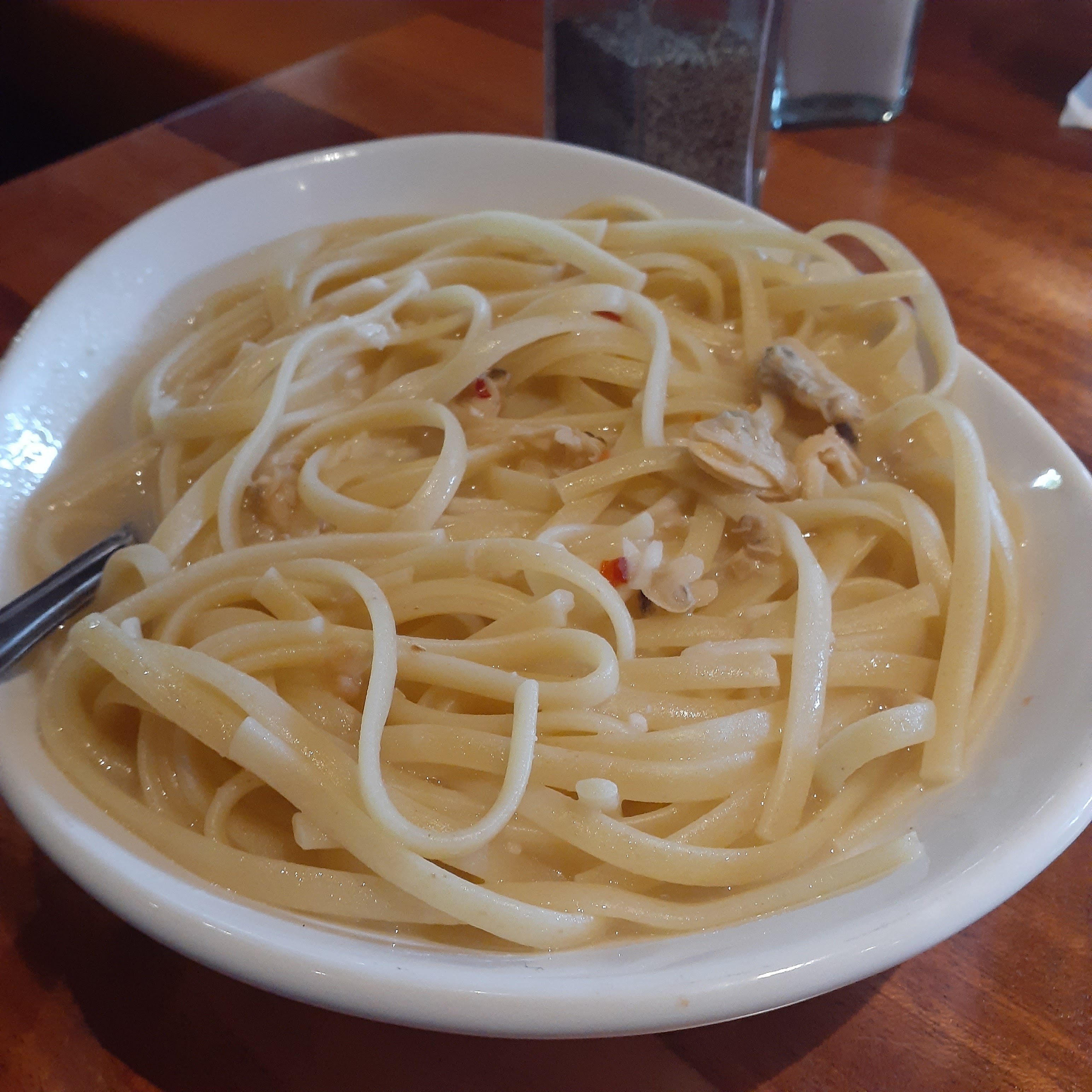 I met my friend Dale to enjoy the clambake at Stancato’s on October 2nd to start the season off right. Like Bruno’s, Stancato’s also serves a very Italiano clambake. They bring out round bread rolls with a lovely Tuscan herb blend on top of them along with a small ramekin of marinara for dipping or drizzling. The rolls are delicious, but I prefer butter over marinara on bread. They then bring out a cup of tasty New England clam chowder. Then my favorite part – the linguini in white clam sauce. Delicious! The third course features a dozen middle neck clams with broth and drawn butter. Again, very tasty and tender. The roasted portion of the meal includes a marinated and roasted chicken, sausage and peppers, roasted parsley red skin potatoes, and buttered corn on the cob. I ate everything that wouldn’t reheat well (chowder, linguini, clams, and corn) and took the rest home for lunch the next day. Delicious!