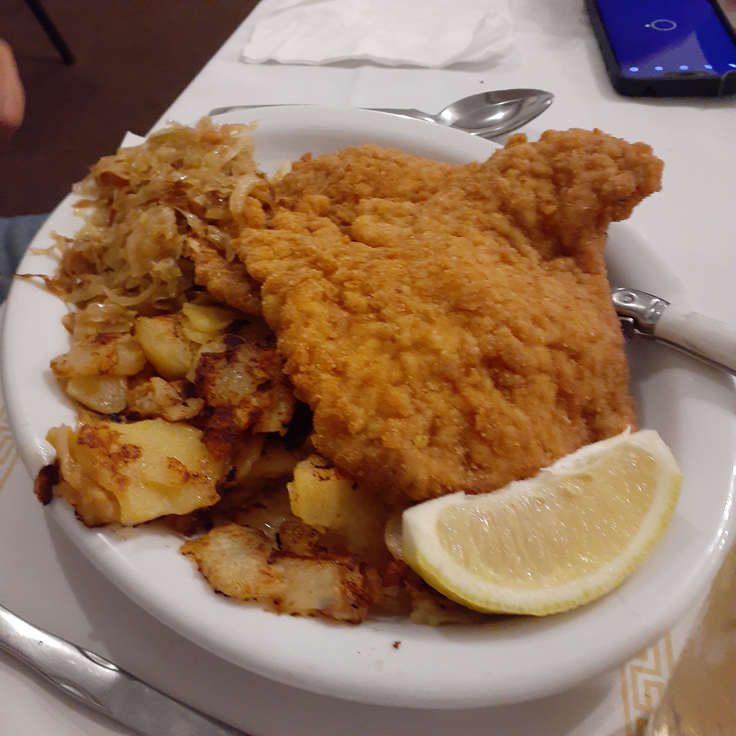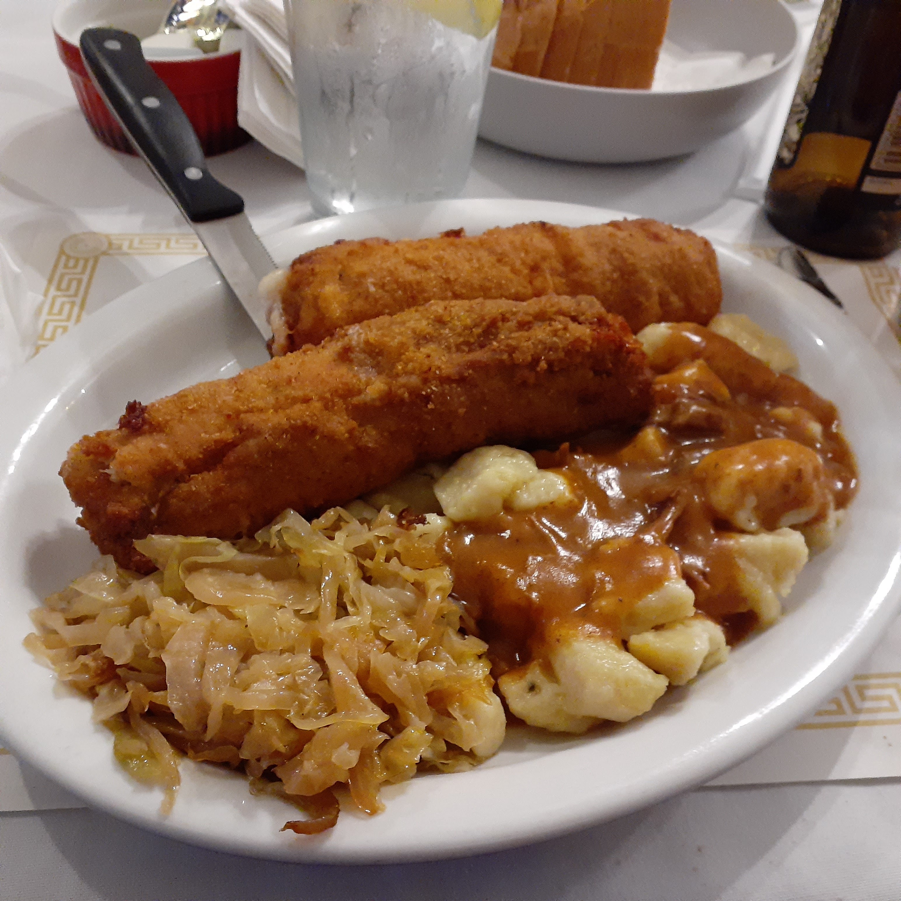 The second time I went I brought my dining out group. I ordered the Schnitzel Cordon Blue and probably won’t ever order anything else. The schnitzel was thinly pounded and wrapped around a generous portion of ham and cheese. Each bite was delicious. I also ordered the spätzle again – and a side of the fried cabbage, which was absolutely delicious. It’s a special side on Wednesdays.