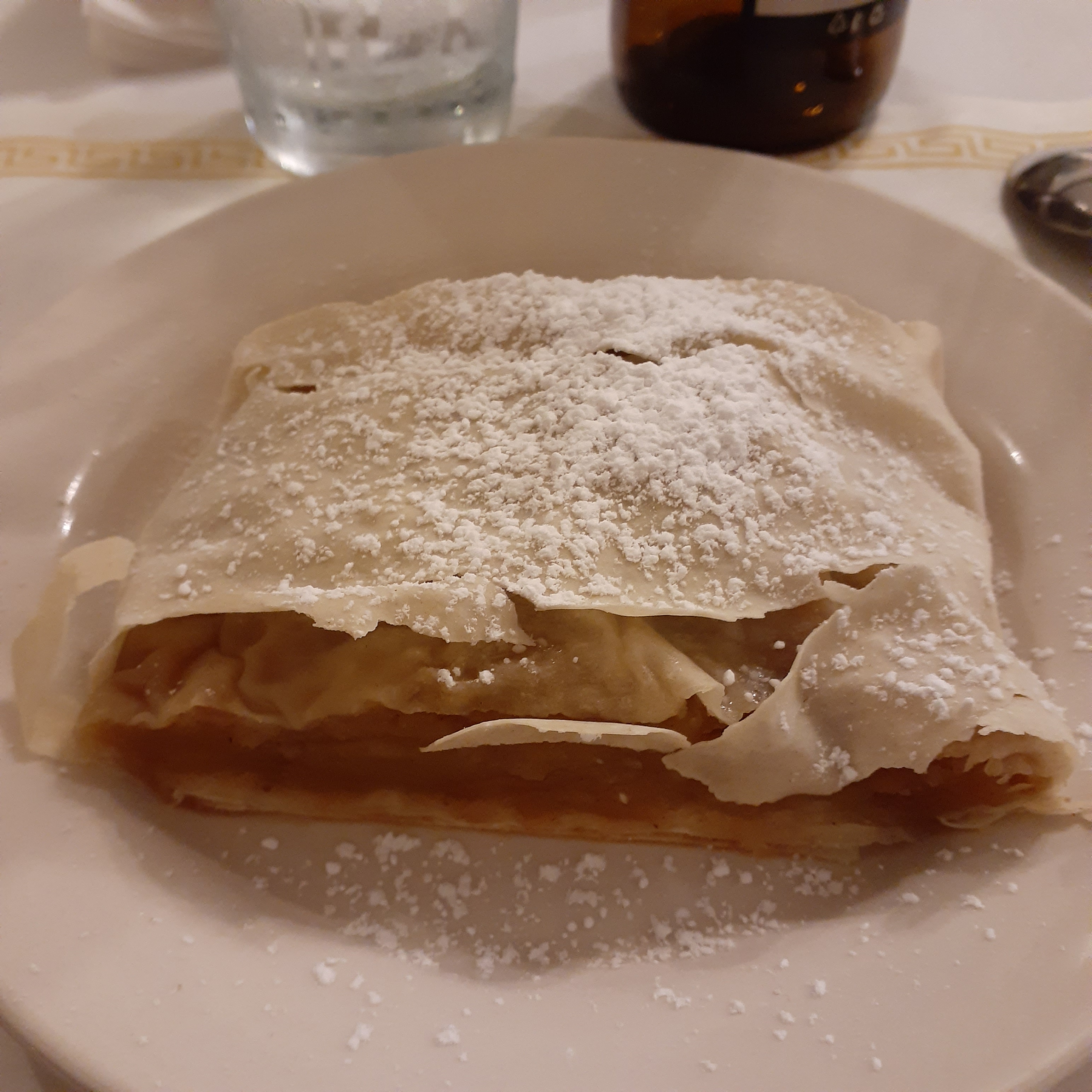 We split several apple strudels, which was just like the thin layered pastry I enjoyed in Austria. Strudel is supposed to be made with multiple layers of thin dough – not puff pastry. This strudel was perfect.