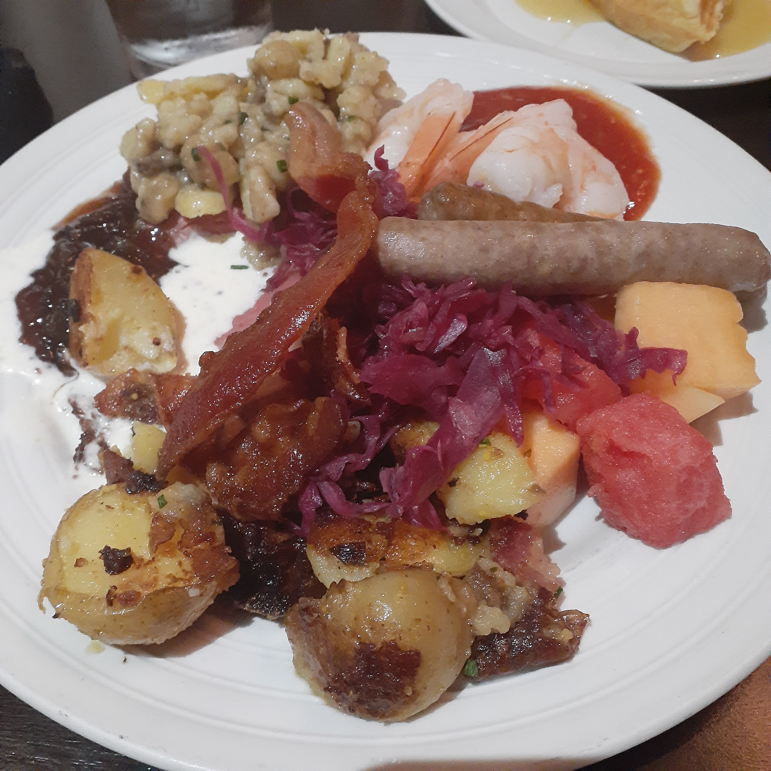 As we entered the buffet room, they had a prime rib carving station with horseradish sauce and smoked red onion marmalade, which was what I was really looking forward to. The next station was the shrimp cocktail and “seasonal salads” table. The salads included a Waldorf salad, mixed greens salad and fresh fruit. The rest of the buffet was grouped over several tables throughout the room. Two tables contained the German foods, including pork schnitzel with a lemon caper-butter sauce, roasted chicken with a cider glaze, herb crusted salmon with a Hefeweizen “beer blanc,” sweet and sour red cabbage, pan fried German potatoes with bacon, green onion and mustard vinaigrette, garlic butter spätzle with caramelized onions and mushroom gravy, and soft pretzel nibs with hot beer cheese dip, onions and gruyere.