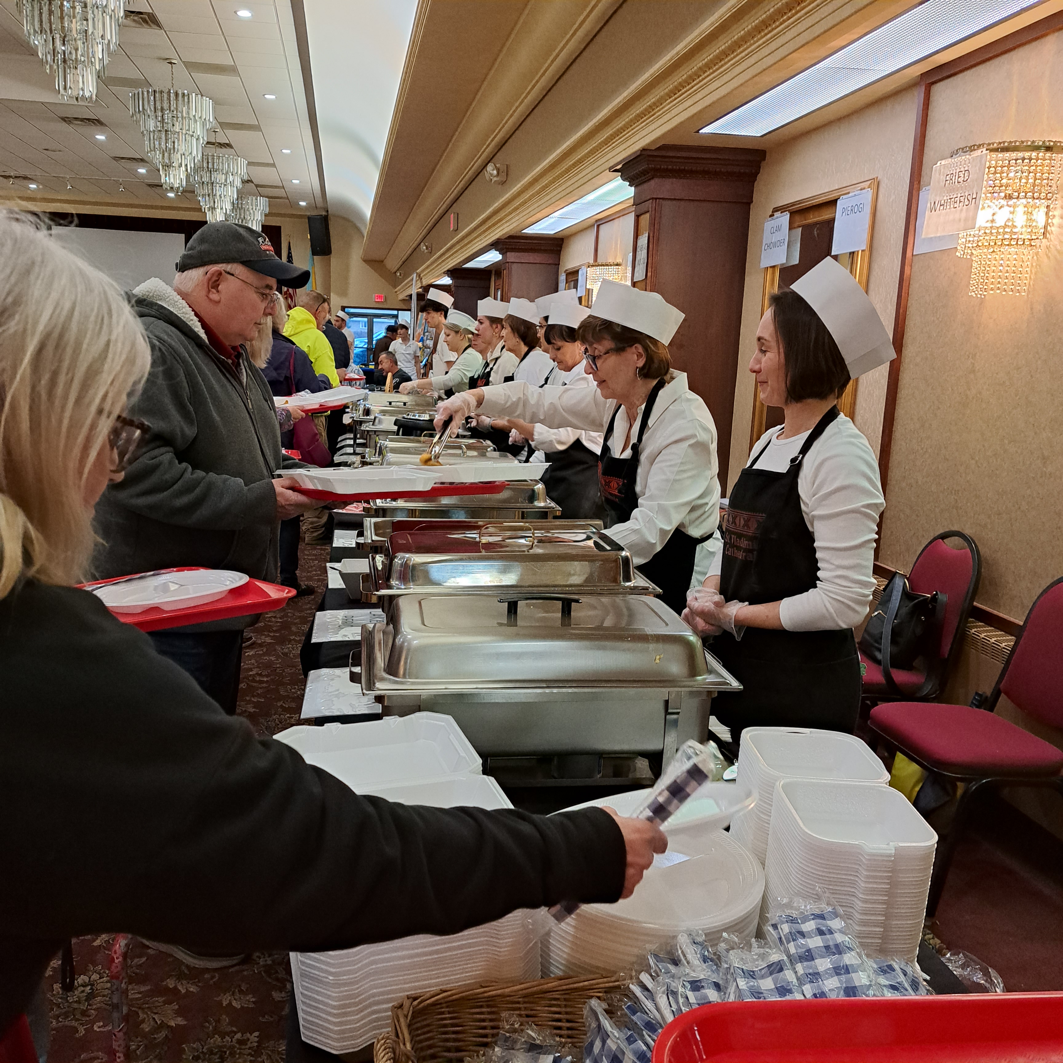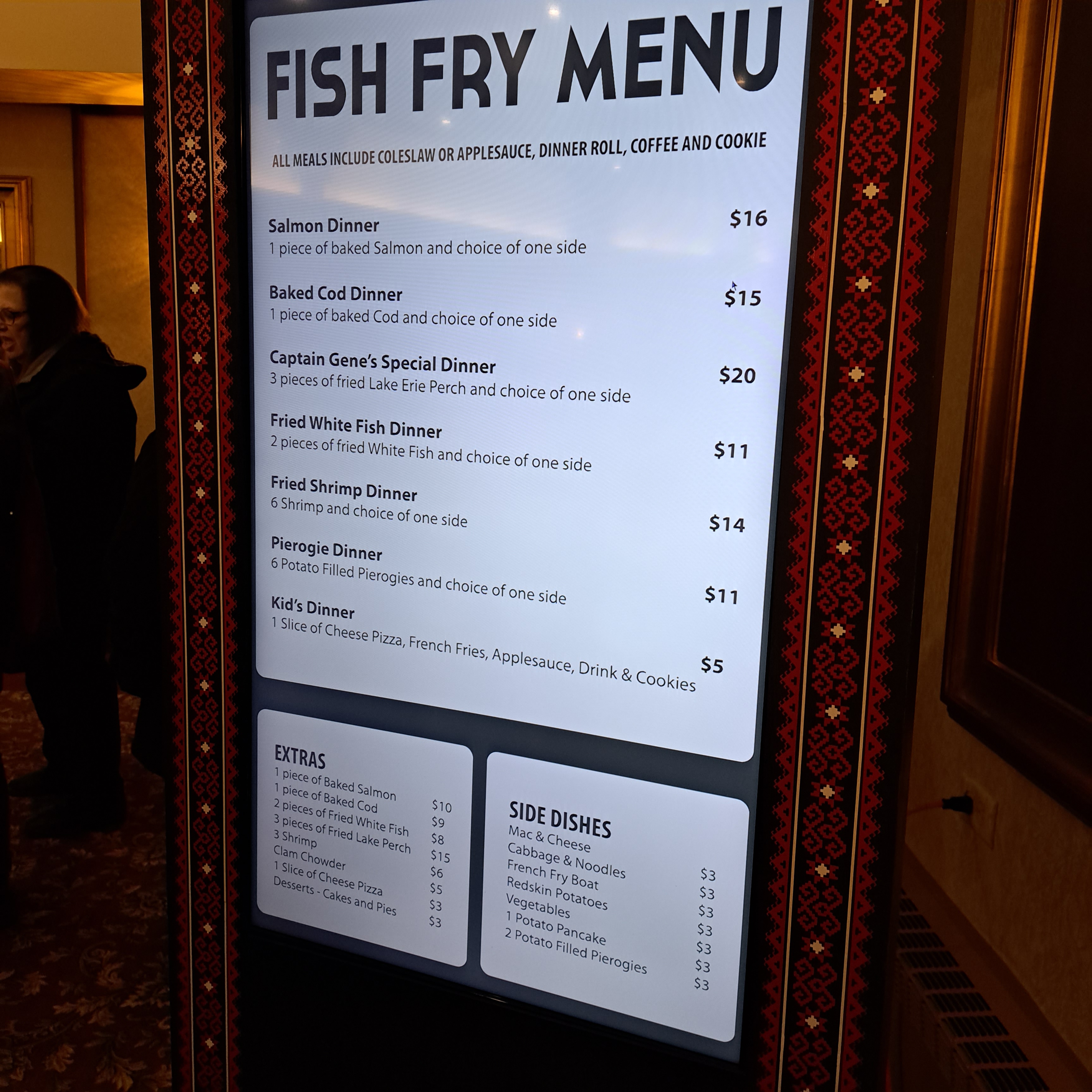 I then pivoted to fish fry #2 on my plan of attack for tonight, St. Vladimir Orthodox Church. I had planned to dine in there after picking up my take-out from St. Charles. St. Vladimir is an impressive church edifice on State Road. I pulled into the parking lot between the church and the Grand Hall, which is where the fish fry was being held, right at 4:30. Their serving time is 4:30 to 7:00. With no available spots in front, I drove around to the back and managed to get a good spot close to the back door. The line was not that long for 4:30, but there was a delay when two gentlemen backed up the line getting multiple to-go orders filled. They must have had six containers each on their trays, and the entire serving table stood there empty and waiting for them to make their way down from the fish. The folks at St. Vladimir need to organize take-out orders better.