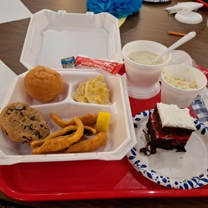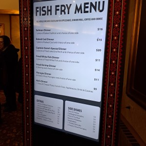 Once it was my turn, I grabbed a tray and utensils and quickly debated whether to grab a to-go container or plate. Knowing I can’t eat a full fish fry meal, I opted for the to-go container. Good decision! They had six dinners to choose from – baked salmon (1 pc), baked cod (1 pc), perch/Captain Gene’s dinner (3 pc), fried white fish (2 pc), fried shrimp (6 pc) and potato pierogi (6 pc). And they also have a kid’s dinner with a slice of pizza, french fries and applesauce. I chose the Lake Erie Perch and, as per Captain Gene’s Special Dinner’s description, was given three meager pieces of perch. When she saw the tiny portion one of the servers gave me a fourth piece, explaining they are allowed some discretion if they feel the pieces are small. I appreciated it. One of my fellow diners suggested I get the cod next time, so keep that in mind.