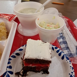 I also added on a clam chowder. It was a decent clam chowder, but could have used a little more salt and pepper. I would have added some if it were on the table. It had nice soft chunks of potato and clam in it and a nice creamy consistency. I also added a piece of cake even though a chocolate chip cookie came with the meal. It was really sweet, but I like the combination of chocolate and cherries so I enjoyed it. It wasn’t a real Black Forest Cake, but real ones are time-consuming to make, so I understand why they did what they did. Pies and cakes were on offer for $3. My meal came to $28 – $20 for the perch dinner, $5 for the chowder, and $3 for the dessert. They accept credit cards, but I paid cash.