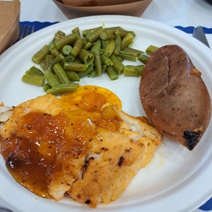 The cod was also quite lovely. I ordered a sweet potato to go with it. It was a delicious, low-fat meal. The mango chutney seems to be a doctored Curried Mango Grille Sauce/mango chutney from Stonewall Farms. It was really lovely. The cod as perfectly cooked and flaky, and the chutney really helped it shine (although it was tasty without the chutney as well). I didn’t need any butter or anything on the sweet potato – it was that good.