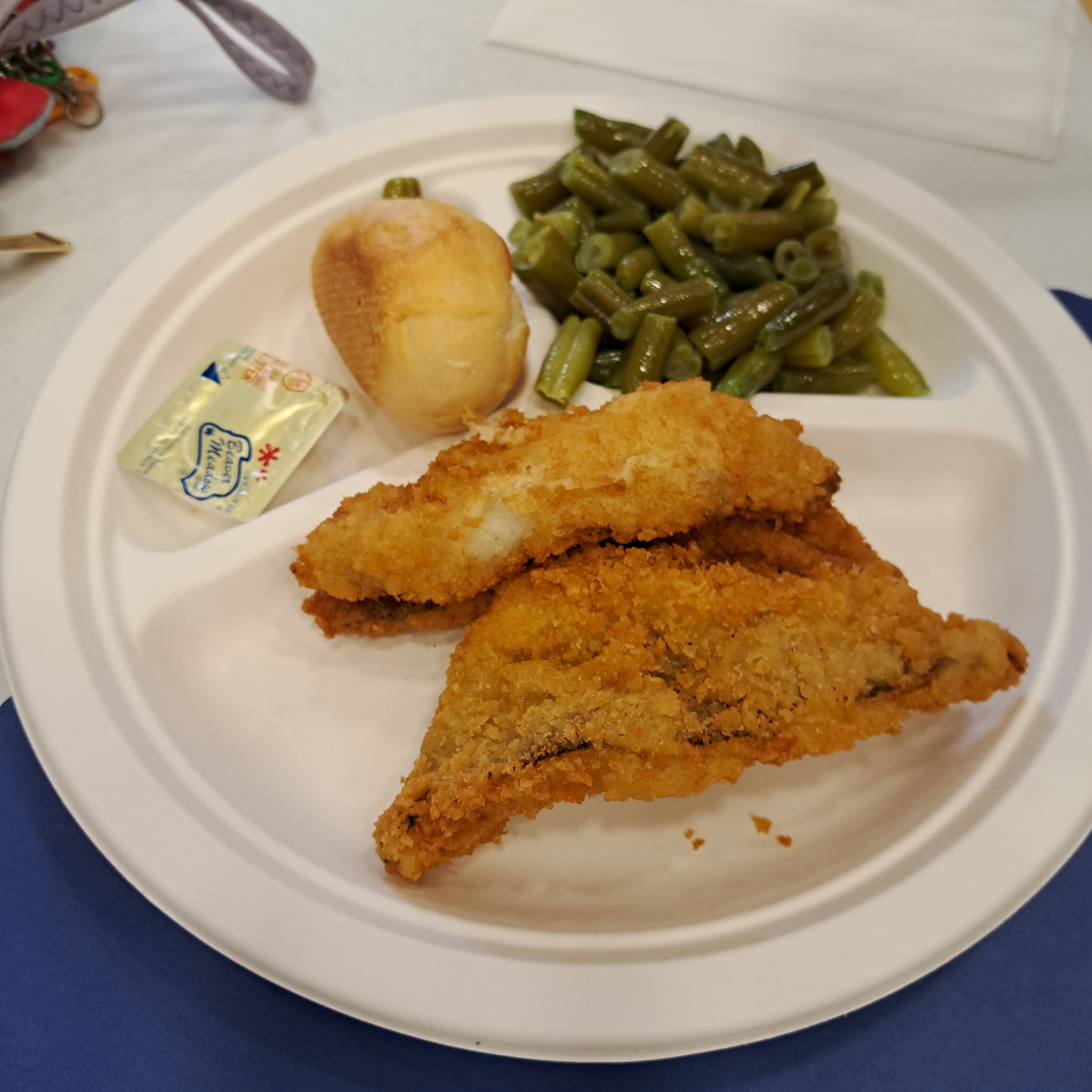 I took a friend with me, and it was so nice knowing how things work. We drove around the church and parked close to the entrance shortly before it opened. We had preordered a perch meal for my friend, the baked cod for me and we shared the corned beef and cabbage. I found my friends from the last visit and joined them once again. My friend and I got into line to grab a tray from the soup station and then headed to the food in front of the stage. Since we were splitting a second meal I didn’t order any additional soup.