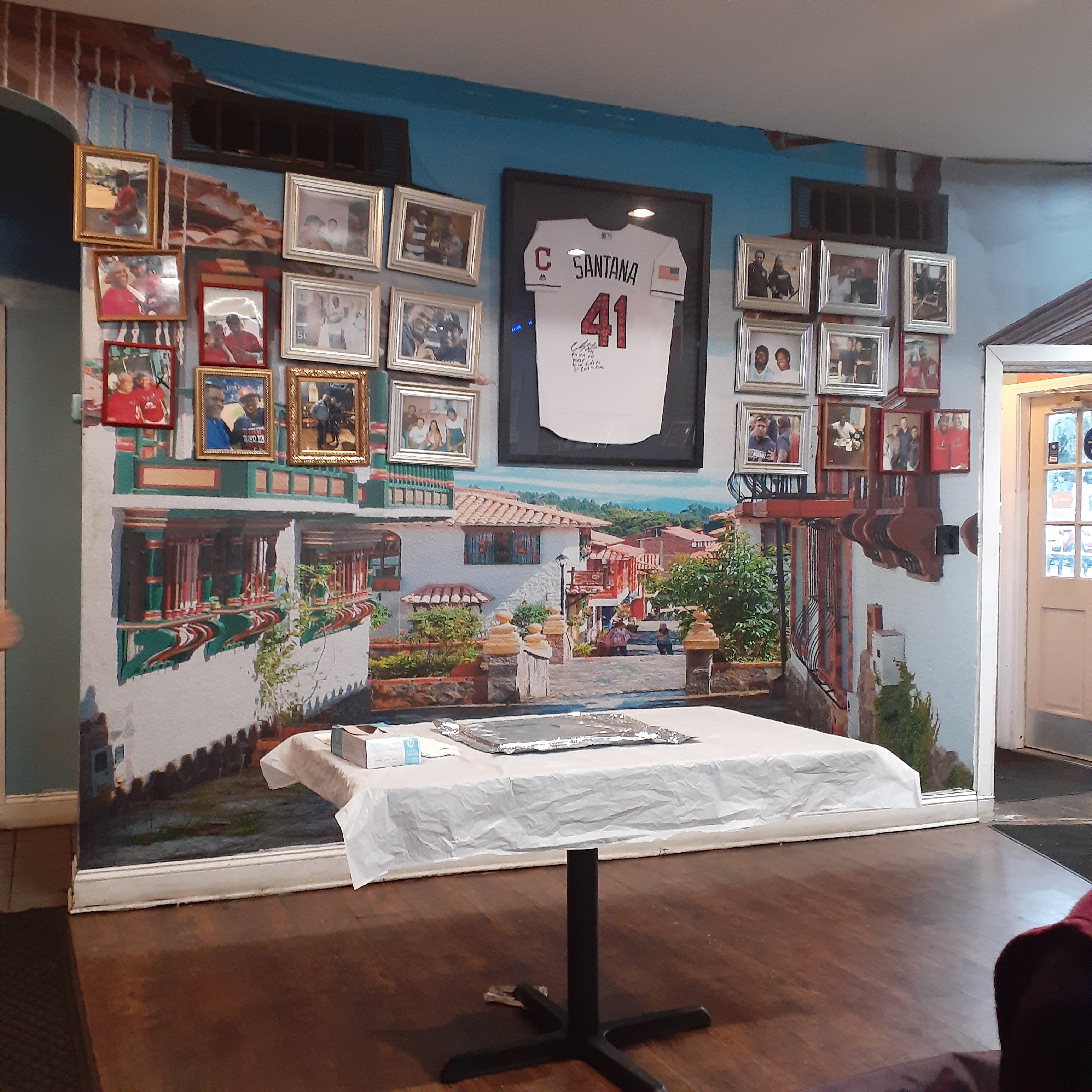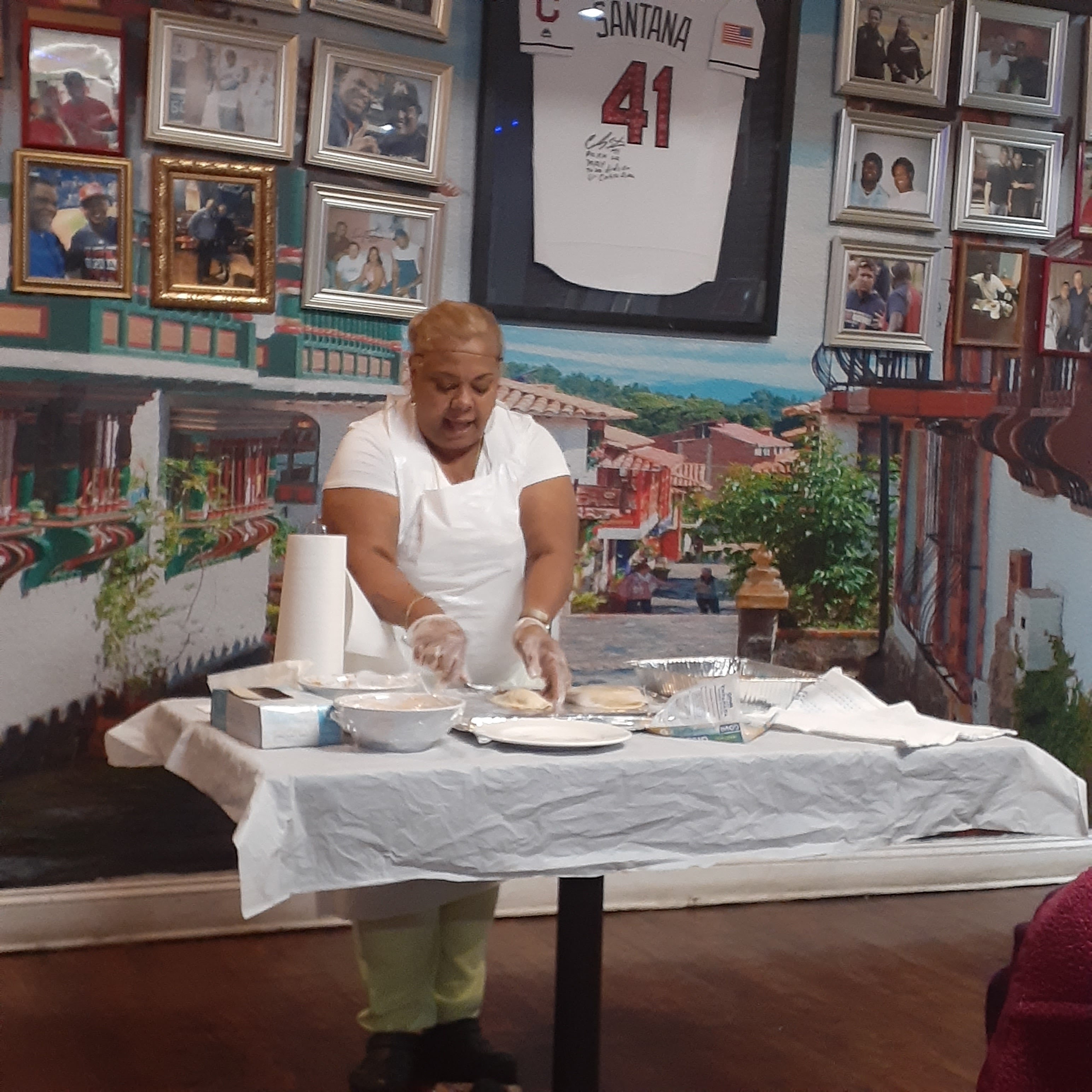 Quisqueya Latin Cuisine (also called Quisqueya La Bella) specializes in Puerto Rican and Dominican dishes like sopa, mondongo (tripe soup), empanadillas, tostones, fried pork with plantains, camarones con mofongo, and stewed beef with rice and beans. It was located in the Clark-Fulton area for seven years, but moved to Denison Avenue a few years ago. It is one side street (east) down from W. 25th/Pearl Road (if you pass W. 23rd you just missed it). Ample parking is available. This is the side view from the parking lot. You can access it from the side road just to the right of the building or from Denison. I have heard a lot of Cleveland Indians – I mean Guardians – eat here because the food reminds them of their homeland. Owner Dulce Hunt is just the sweetest person and has greeted my groups twice now.