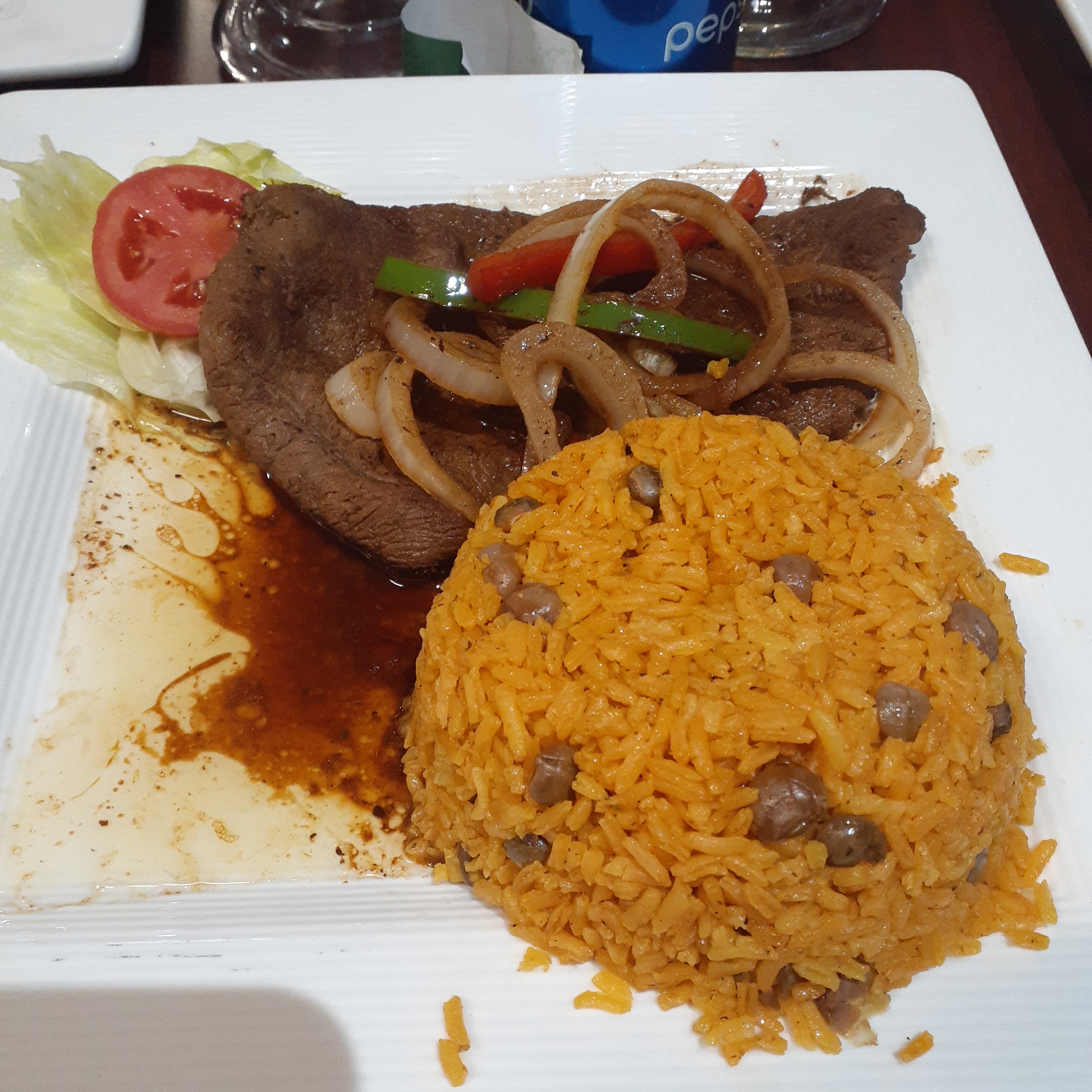 Each entree came with one side and a little lettuce and tomato. You can choose from Arroz Blanco y Habichuelas (white rice and pinto beans), Tostones (fried plantains), Maduros (sweet plantains), the previously mentioned Moro/Arroz de Gandulez, Mangu (boiled plantains that are then mashed with butter, margarine or oil in the water in which they were boiled, then finally topped with sautéed red onions that have been cooked with vinegar), Mofongo (fried green plantains that are mashed with garlic and mixed with pork cracklings, then shaped into a ball and served in a ball), or French fries.