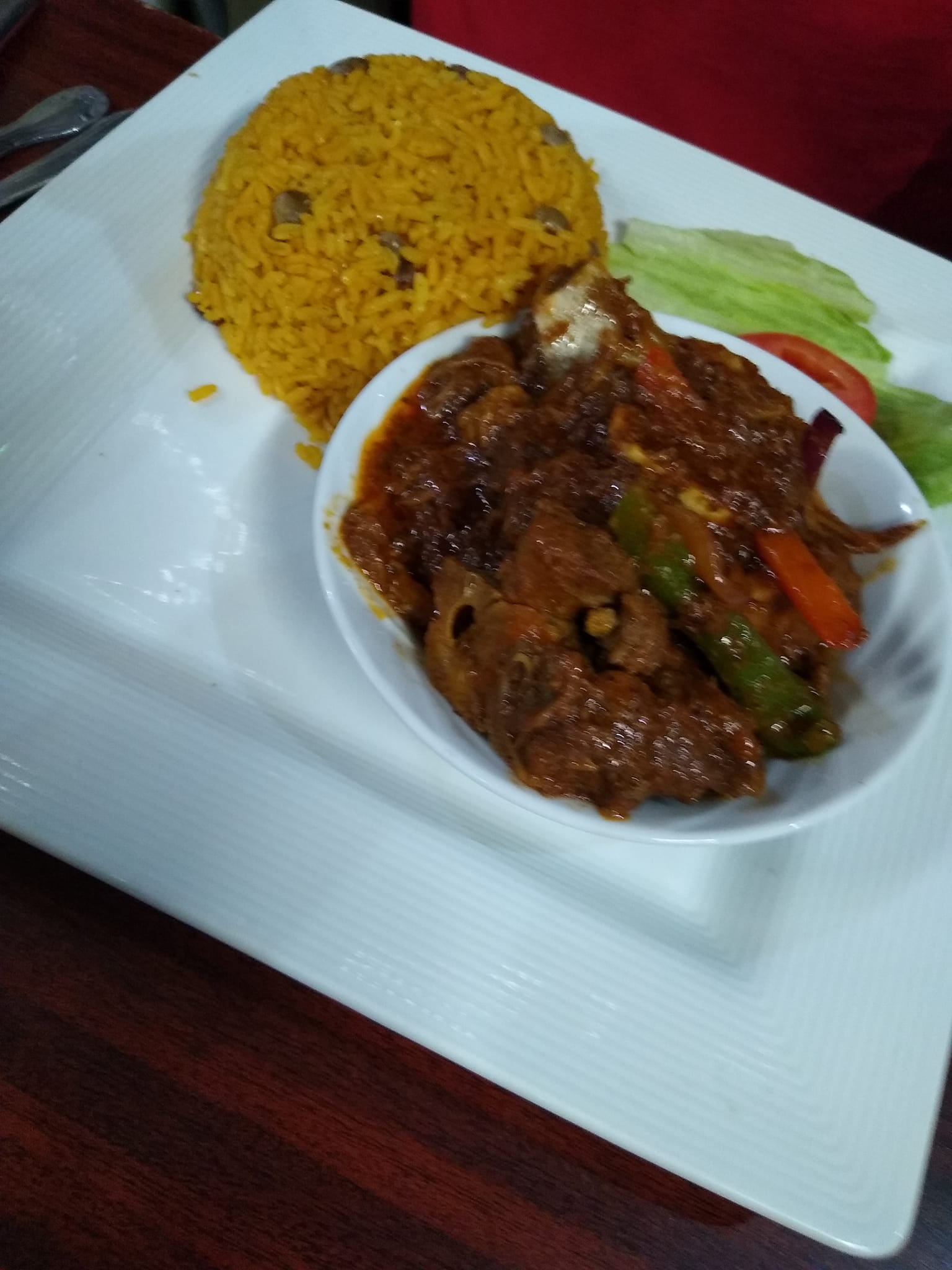 Row 2: Steak and onions with rice/pigeon peas, stewed goat with rice/pigeon peas