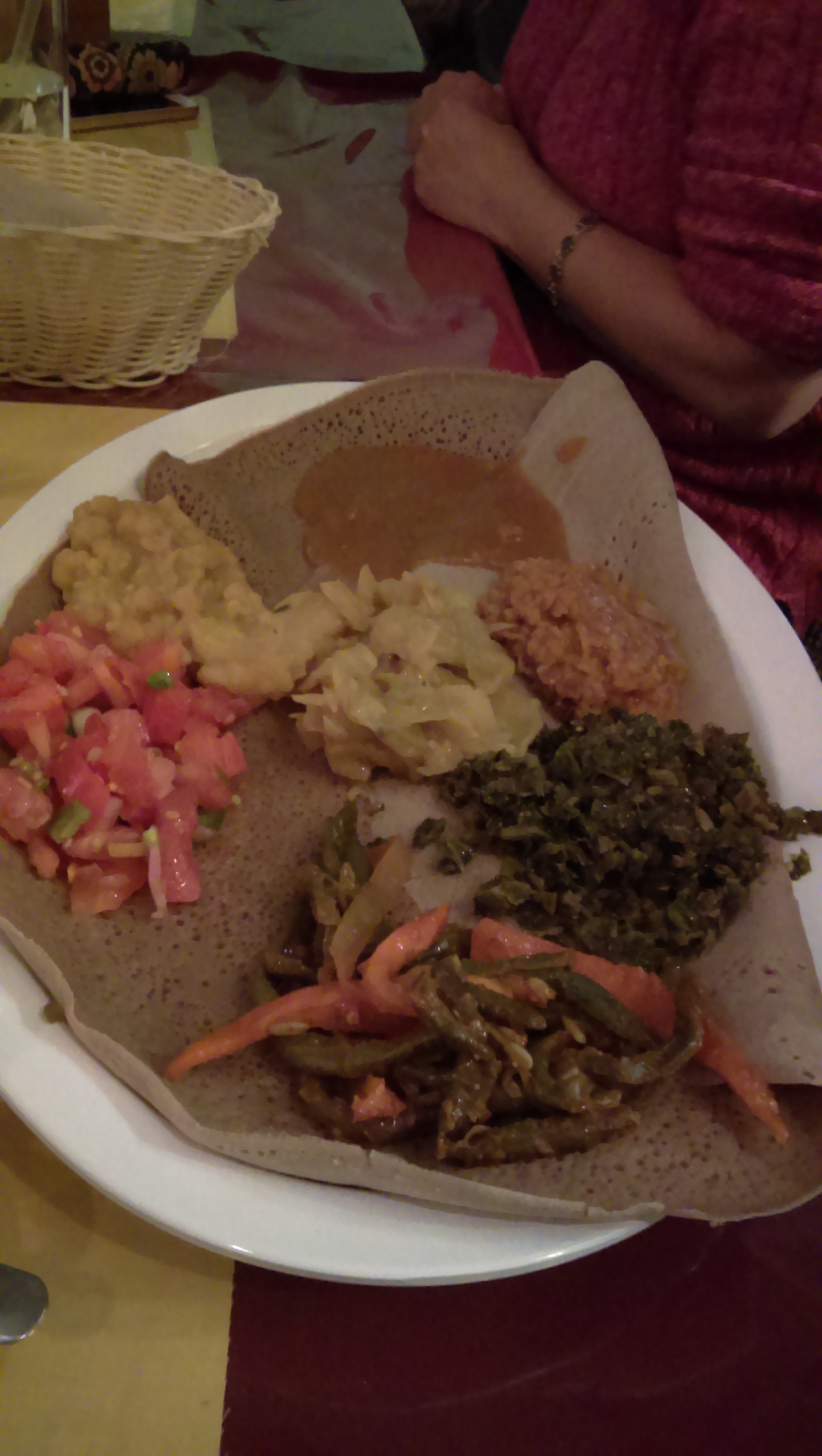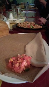 We went as a large group right in January 2017 after it opened and had a great time. They do not take reservations, but appreciate the heads up if there is going to be a big party. The dining room isn’t as homey as Empress Taytu, but it is still decorated nicely and has plenty of seating. They serve lunch from 11:45 to 2 and dinner from 4 to 9 (3 to 8 on Sundays). The lunch special is quite a good deal – two vegetarian entrees (not including the tibs) for $10.99, and you can add an extra veggie entree for $4. Extra injera is $2. The spicy beef stew and one veggie entree is $12.99.