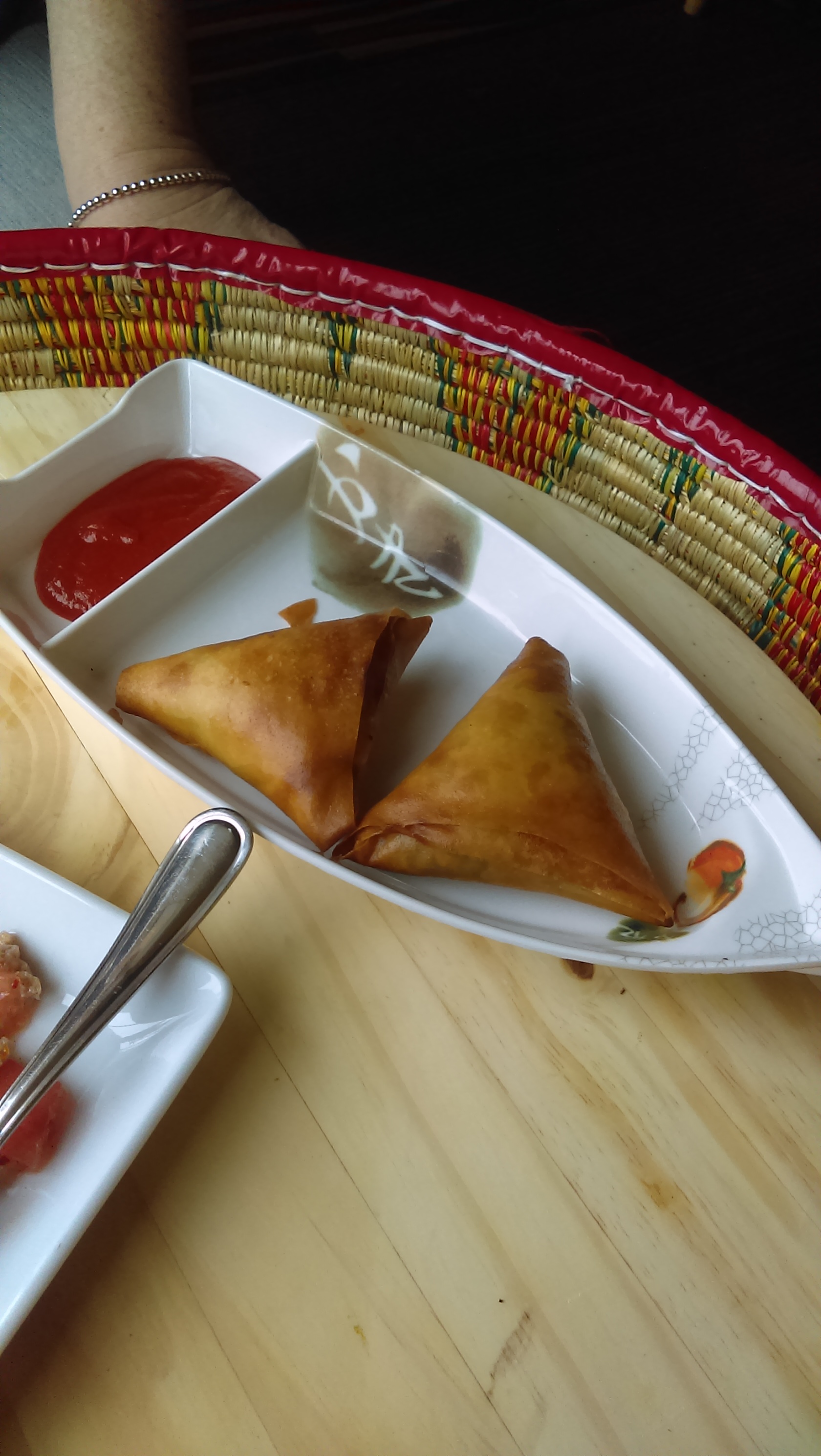 I met a vegetarian friend for lunch there a little while later, and we sat at one of the basket tables. We enjoyed the samosas (small vegetarian pastries filled with sauteed whole lentils, onions, and jalapeno pepper and served with a sweet chili dipping sauce) as well as the tim-tim fit fit, which is made with pieces of injera bread mixed with chopped fresh tomato, onion, jalapeno and Ethiopian herbs. The fit fit is obviously quite spicy, but it was really tasty. We both ordered vegetarian combos that day. I ordered my beloved tikil gomen (on the menu as simply “cabbage”), the collard greens and green beans and carrots, while she ordered the cabbage, green beans and carrots and split red lentils. The split red lentils are simmered in a medium hot berbere garlic and onion sauce, while the split yellow lentils are milder and simmered with onions, garlic, and turmeric.