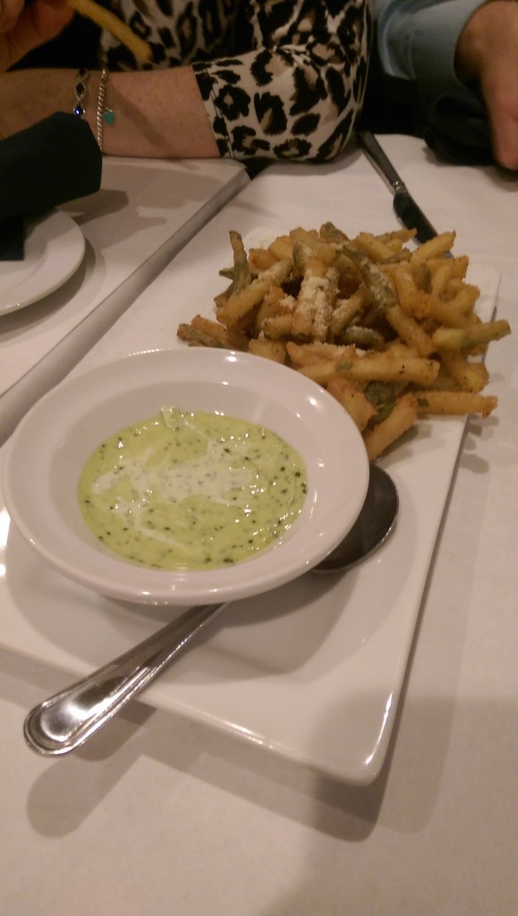 The Zucchini Frites are a great starter – crispy, seasoned, and delicious – and the basil aoli is divine. Our dining group polished it off by sharing it up and down the table, and everyone really enjoyed it.