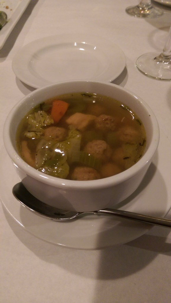 The Italian wedding soup contains generously sized meatballs, shredded chicken, escarole and napa cabbage, pastina and chunks of carrots and celery. It was tasty. I think it is one of the better Italian wedding soups in town.