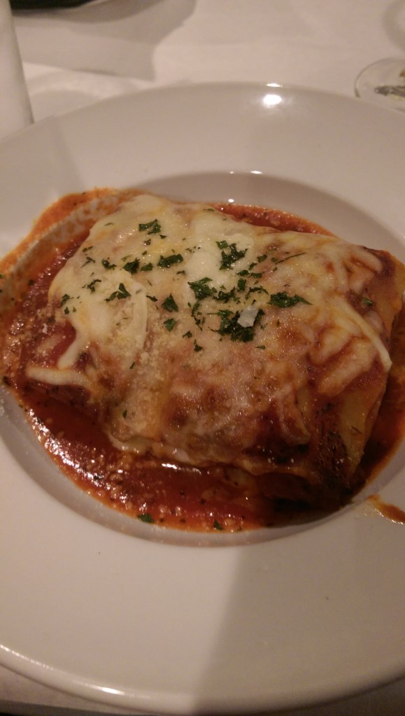 The runners who brought out our food were efficient, but we did have to ask someone for the coffee my friend ordered after she had had her tiramisu for a while. Also, when I asked about the Monte Cristo after-dinner drink the bartender admitted she had been working there since March (it was November) and had never made one. Obviously I didn’t order it, but it is really nice to be able to order a drink because the town was dry when I was growing up and residents had to cross the town line to drink alcohol in an establishment. My friend enjoyed her cocktail, which she said had lots of bourbon, and a glass of Chianti with dinner. I had a pumpkin martini, which was perfectly prepared.