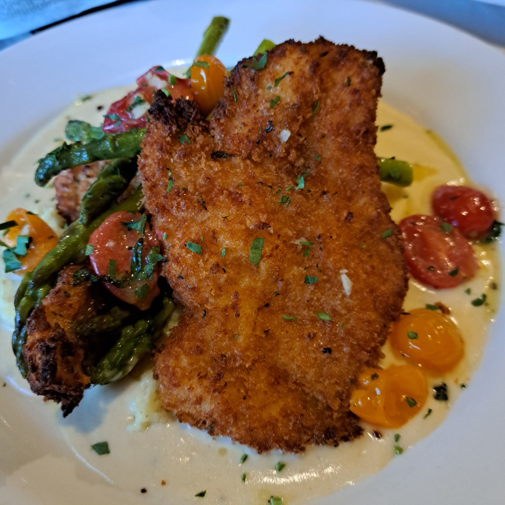 I asked our waitress which entree she recommended – the Chicken Matteo or the Shrimp Matteo – and she quickly answered “Chicken Matteo.” The Chicken Matteo is their signature dish and is billed as breaded chicken with “romano cheese, tomatoes, asparagus, lobster sherry sauce, served with mashed potatoes.” The mashed potatoes were smooth and creamy, and the two chicken cutlets were perfectly cooked. The lobster sherry sauce didn’t seem very “lobstery” or sherry-heavy. It just seemed like a cream sauce. It was very good and reheated well.