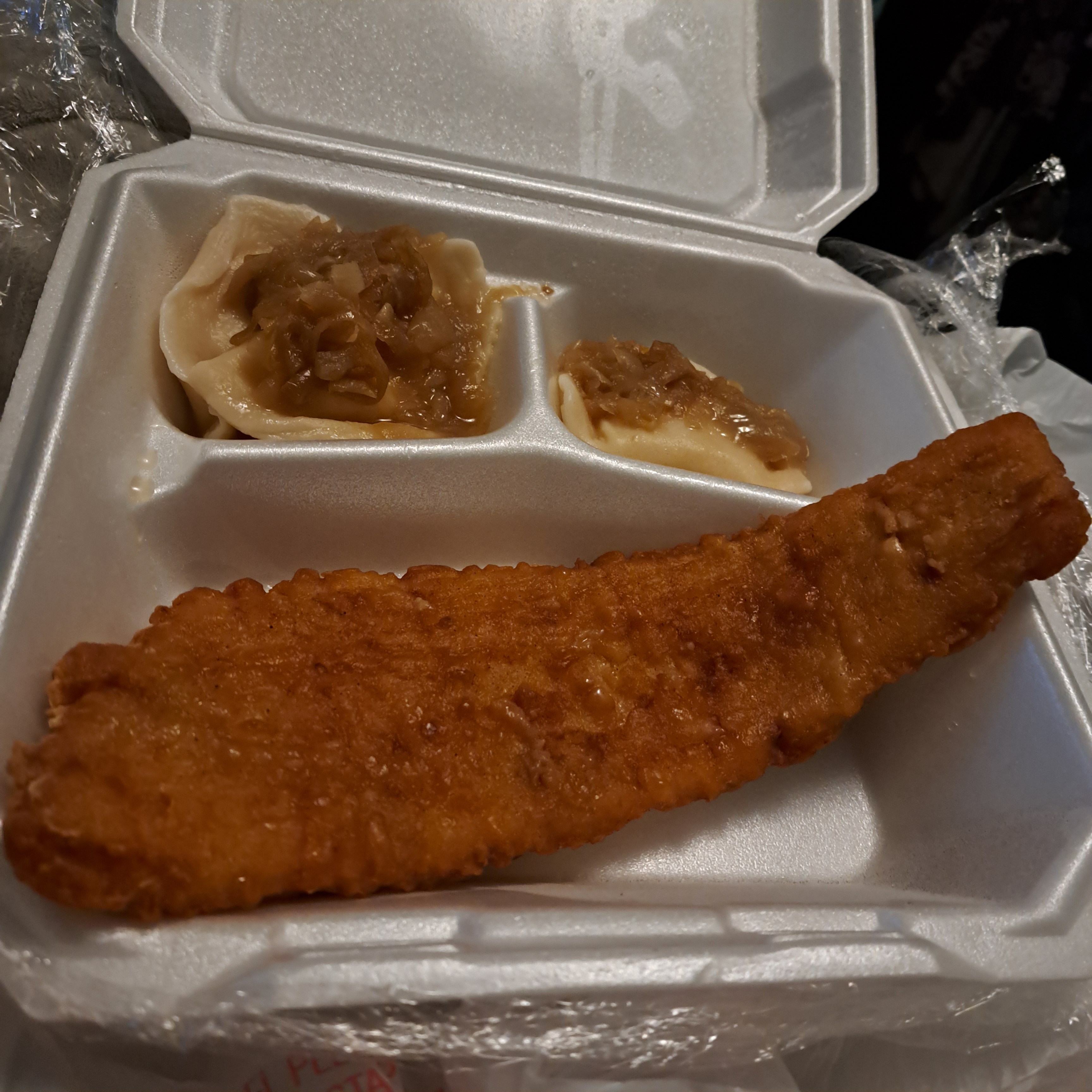 I am so glad I chose Mom’s Pierogies, which I had never heard of before their post (social media works, folks!). In my opinion, an excellent fish fry always includes pierogi (plural: pierogi or pierogies or pierogis, but I prefer without an s – it’s the language geek in me). For the uninitiated, pierogi are small, semi-circular ‘dumplings’ made of dough and filled with a range of ingredients, which can be sweet, savory or spicy. They are a staple in Cleveland, and some would argue that these little pockets of deliciousness are also the national dish of Northeast Ohio. Mom’s Pierogies specializes in gourmet Polish pierogies, and you should not sleep on these pierogies. Although they were smaller and not as filled as I prefer the dough was so delightfully soft and almost melted in my mouth. These were stellar pierogies! Anyway, I digress… We are here for the fish fry.