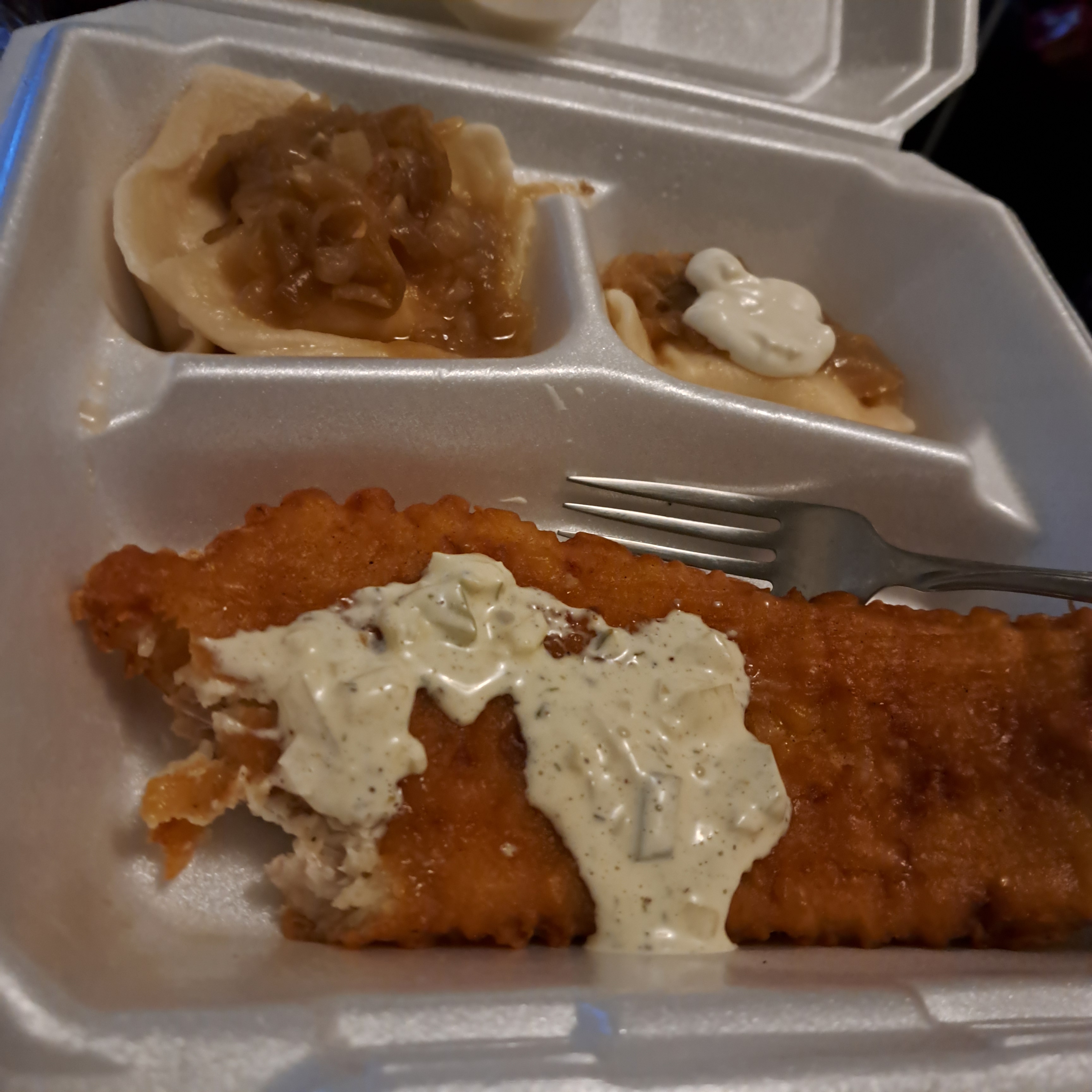 Every single component of this meal was outstanding – there was not a miss in the styrofoam container. Even the little details like the tartar sauce, carmelized onions and butter, and garlic sour cream (!!!!) were outstanding. The fish is a 9 oz. pollock. It was lightly breaded and perfectly fried. The fish itself was moist and flaky and simply delectable. The housemade tartar sauce was an excellent addition, but it was even tasty without it. I ordered an extra pierogi for $2 and should have ordered more. These pierogi were so good! Most pierogi dough is a little thick and chewy. These were thinner and soft and pillowy – and had a tasty potato filling. The pierogi have been handed down from the owner’s Polish mother’s recipe. I can see why. These are the softest pierogi I have ever enjoyed. The garlic sour cream was ethereally good. You can choose between regular or garlic. Get the garlic! It isn’t overpowering and just gilds the lily. I wished I had ordered more extra pierogi, because I only had one left for lunch the next day and you can eat them in a couple bites even if you are savoring them. I would drive all the way back for a pierogi dinner, but they also serve stuffed cabbage that looks right up my alley, so…