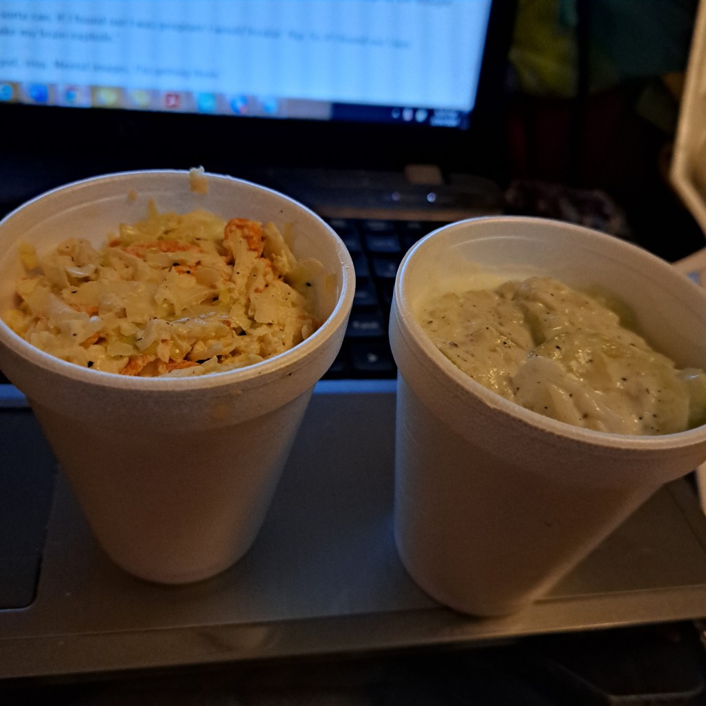 I also added a side of cucumber salad, because it never hurts to have a veggies to balance the fried food. LOL The cucumbers are small and sliced razor thin. They are drenched in a sour cream and onion dressing that I really enjoyed. This was a quality cucumber salad. It is also available in 1 and 2 lb portions. Even cole slaw was a revelation. I definitely detected a heavier pepper presence, which I enjoyed, but there is an herb mix that I can’t quite place (dill? thyme?). The mayo-based cole slaw was delicious, and I enjoyed every forkful of it as well.
