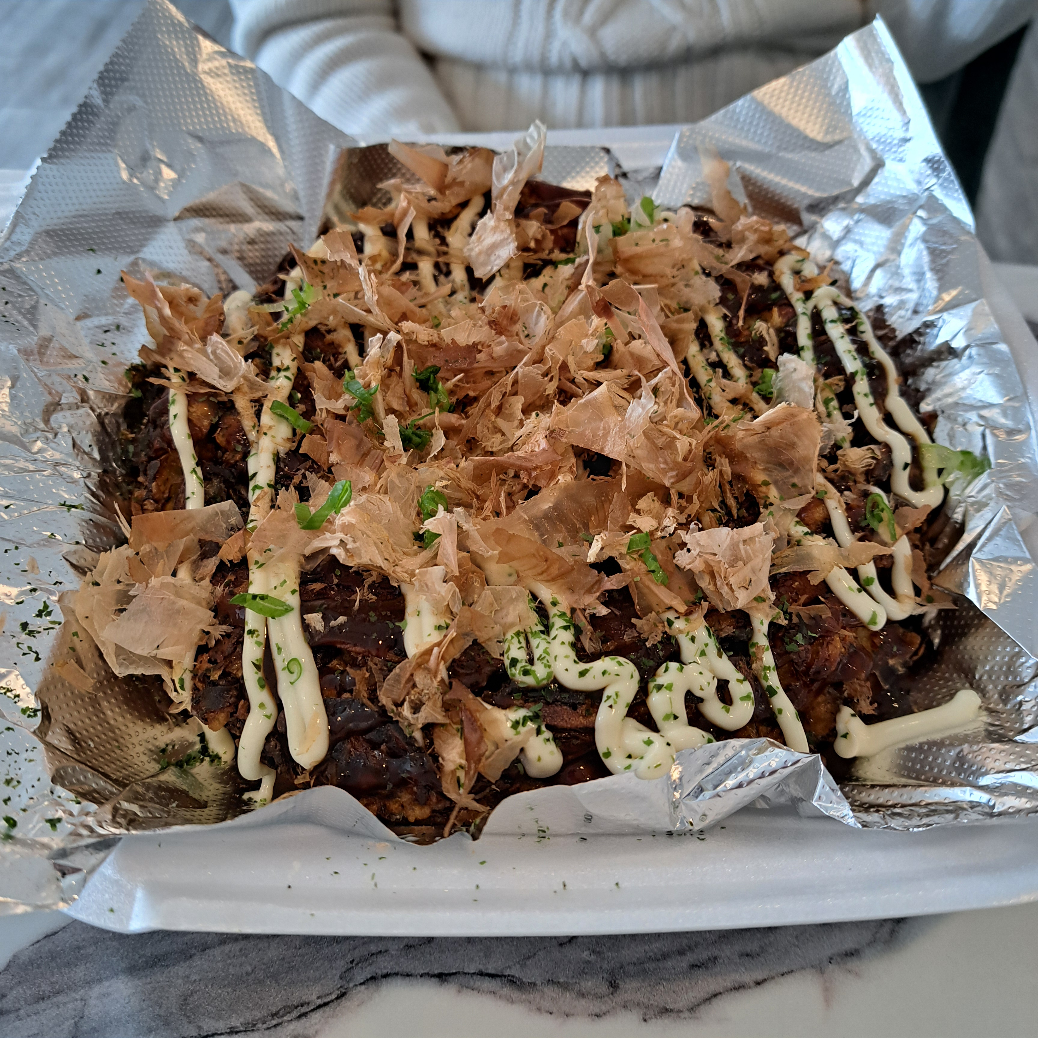 If you want something tasty and hot (but not fried), order the shrimp okonomiyaki. Okonomiyaki is a savory pancake dish consisting of wheat flour batter and other ingredients cooked on a teppan grill and topped with okonomiyaki sauce, mayo, powdered seaweed, scallion and bonito flakes. My friend ordered the pork belly okonomiyaki and loved it. She used to make it all the time for herself and her kids, and she really liked this version. She lamented it didn’t have pickled ginger, but she really enjoyed the flavor of the cabbage, scallions, batter, pork belly, and toppings. I’ve had the shrimp version before and loved it. I enjoyed the bite she shared with me.