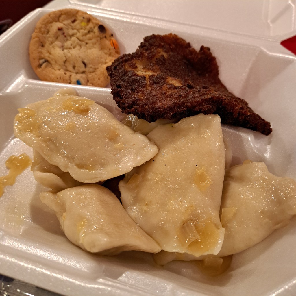 Last year one of the parishioners suggested I order the cod next time, so I went with his suggestion and ordered the baked cod dinner to dine in and a pierogi dinner to go. The cod was perfectly baked and had an herbacious crumb crust. I ordered the cabbage and noodle to go with it, which was tasty. But the pierogi are still my number one! The helper who carried my tray for me suggested the potato pancake as my side for my pierogi dinner, which, as I said, I got to go and will eat for the next few days. I ate half of the cod, roll, and cabbage and noodles and put the other half in the to go box holding the pierogi dinner.