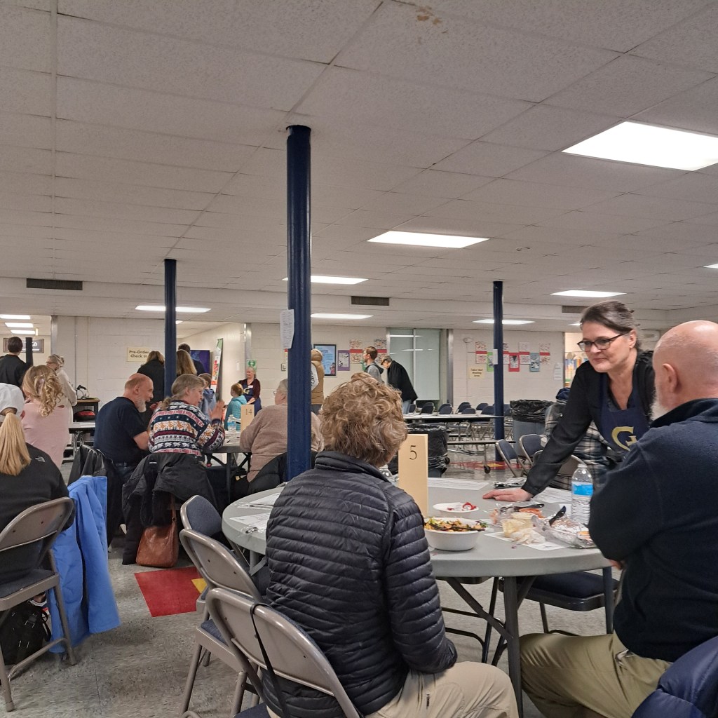 I entered the building and walked down the stairs to be greeted by a friendly woman at the door of the cafeteria. Once I told her I was a walk-in without a pre-order, she pointed me in the direction I needed to go (straight ahead). Pre-orders and to-go orders veer to the right, and there are rows of chairs available to wait for your order. I filled out my form and paid my money and was told to go to table 18. Table 18 didn’t work for me, so they easily managed to amend my order to table 4. It was brought out to me as I was sitting down. I sat with a delightful older couple with whom I enjoyed talking. They and their friends tried to recruit me for the choir. It was sweet, but the chances of this Lutheran making it to a Catholic morning mass (let alone an hour before mass to practice) are slim to none. But they definitely made me feel welcome.