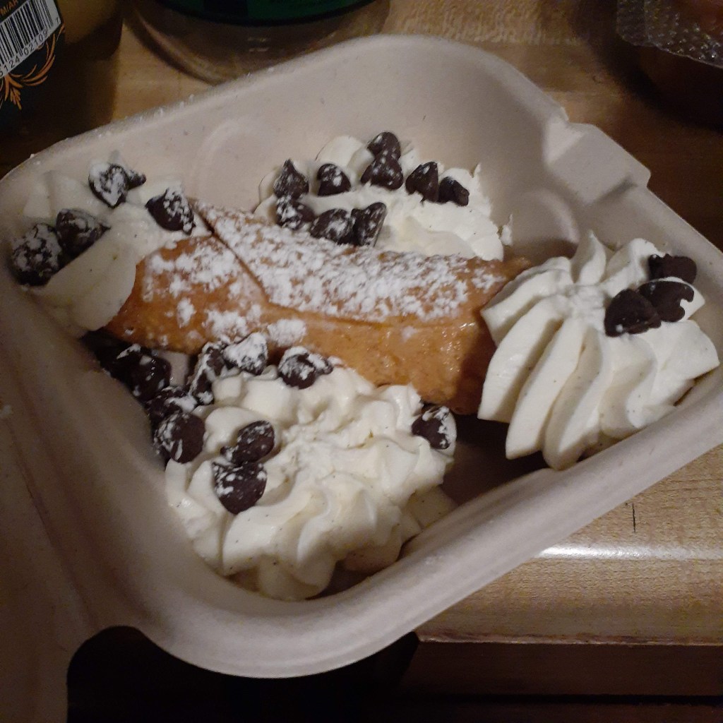 Chicken Ranch is also known for its homemade cannoli. They are next level. I’m fairly certain the cannoli I got on my first visit was a chocolate chip cannoli, but they have a banana cream cannoli on the menu now. Who doesn’t love banana cream??? It’s one of my favorite things in life. I really enjoyed the cannoli. The shell was crisp and shattered nicely, the filling was delicious, and I am fairly certain the whipped cream was real whipped cream and not the fake stuff.