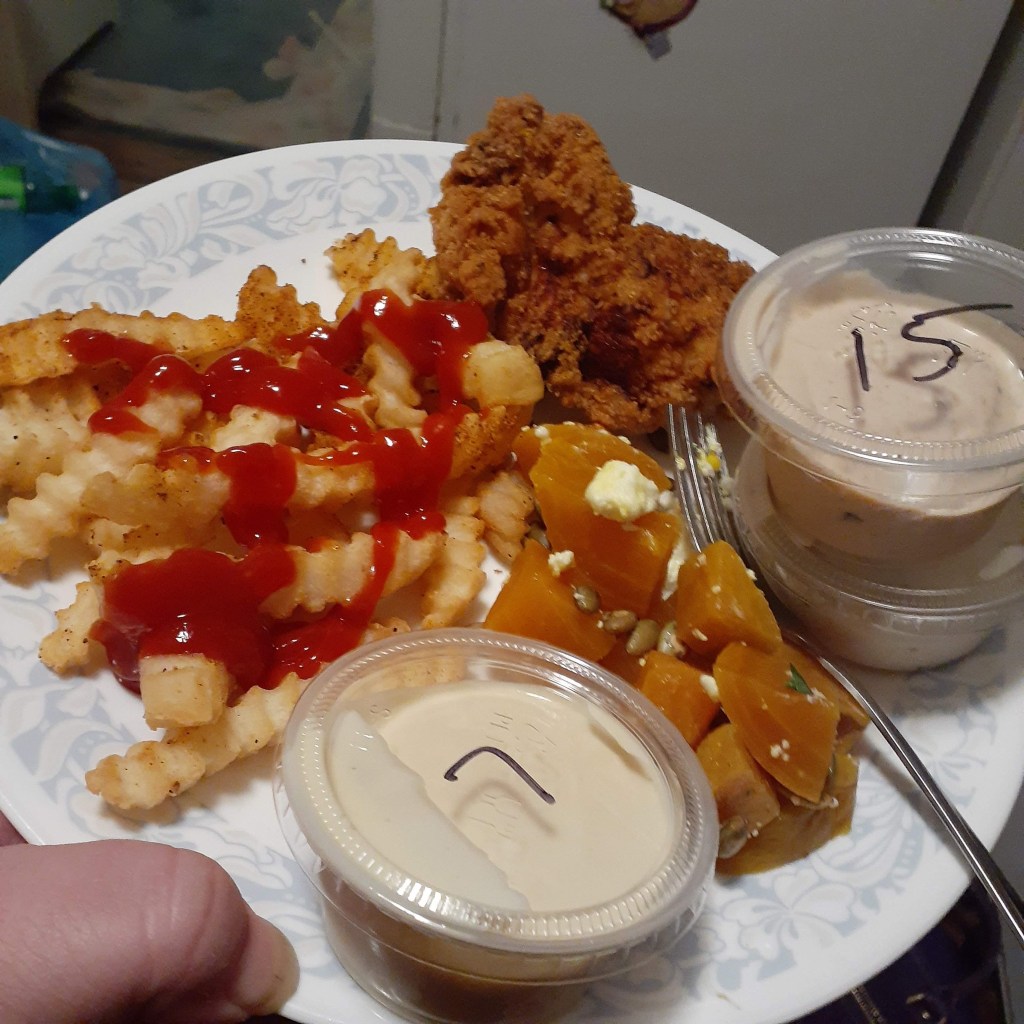 The chicken tenders are almost the size of entire breasts – not thin tenderloin strips. During my first visit I ordered the tenders (3 for $13) and was not disappointed. They were so big I couldn’t eat them in one sitting. You can order them as regular batter dipped or grilled. They have 15 different homemade sauces to choose from, ranging in spiciness level from the House BBQ and Comeback Sauce (which is keto-friendly) to Black Garlic Toum, Kim Chi Hot Sauce, Dragon Fire Honey Butter, Cleveland Hot Sauce and Nashville Hot Oil. The spiciness level is indicated on the menu. I’m partial to the honey mustard. The tenders came served with a mini jalapeno corn bread, which was super tasty. I also ordered the crinkle fries and beet salad, which was made with golden beets, jalapeno and goat cheese. It is unfortunately no longer on the menu. Maybe it’s a seasonal side. It was a nice, refreshing side to balance out the fried tenders and fries. The fries were nicely cooked, with a crisp exterior and creamy interior, and dusted with a nice seasoning.