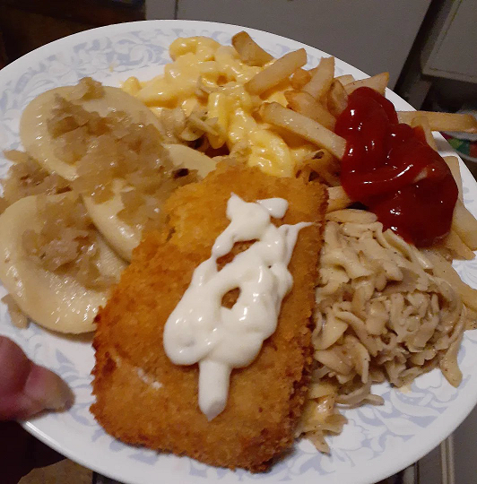 As for the food, the fish is obviously the star here. I ordered the “fried perch” dinner, but they also offer baked cod, shrimp, crab cake, mac n cheese, or combo (choice of two: fish, shrimp or crab cake) dinner options. The dinners come with your choice of home fries or french fries and coleslaw or applesauce as well as a slice of bread and a dessert (slice of strudel). You can also order strudel to go. What I thought was mashed potatoes on some dine-in trays were actually the home fries. They were white and mashed potato-like and I was afraid they were going to be bland, but they had a nice flavor to them. The fried fish was actually quite tasty, and it was perfectly cooked. The fish was nice and moist and the batter was crisp. There were three fillets of fish, and they were a decent size. I really enjoyed it, but they didn’t canoe up too much. The curl indicates if it is real perch or pike or zander. The most obvious way to tell Great Lakes perch from other fish of approximately the same size and shape (other than taste) is that Great Lakes perch is always joined at the belly. Perch also curls up (or as I call it canoes) quite a bit when it is fried. These did not curl that much, but they were nicely cooked and reheated well.