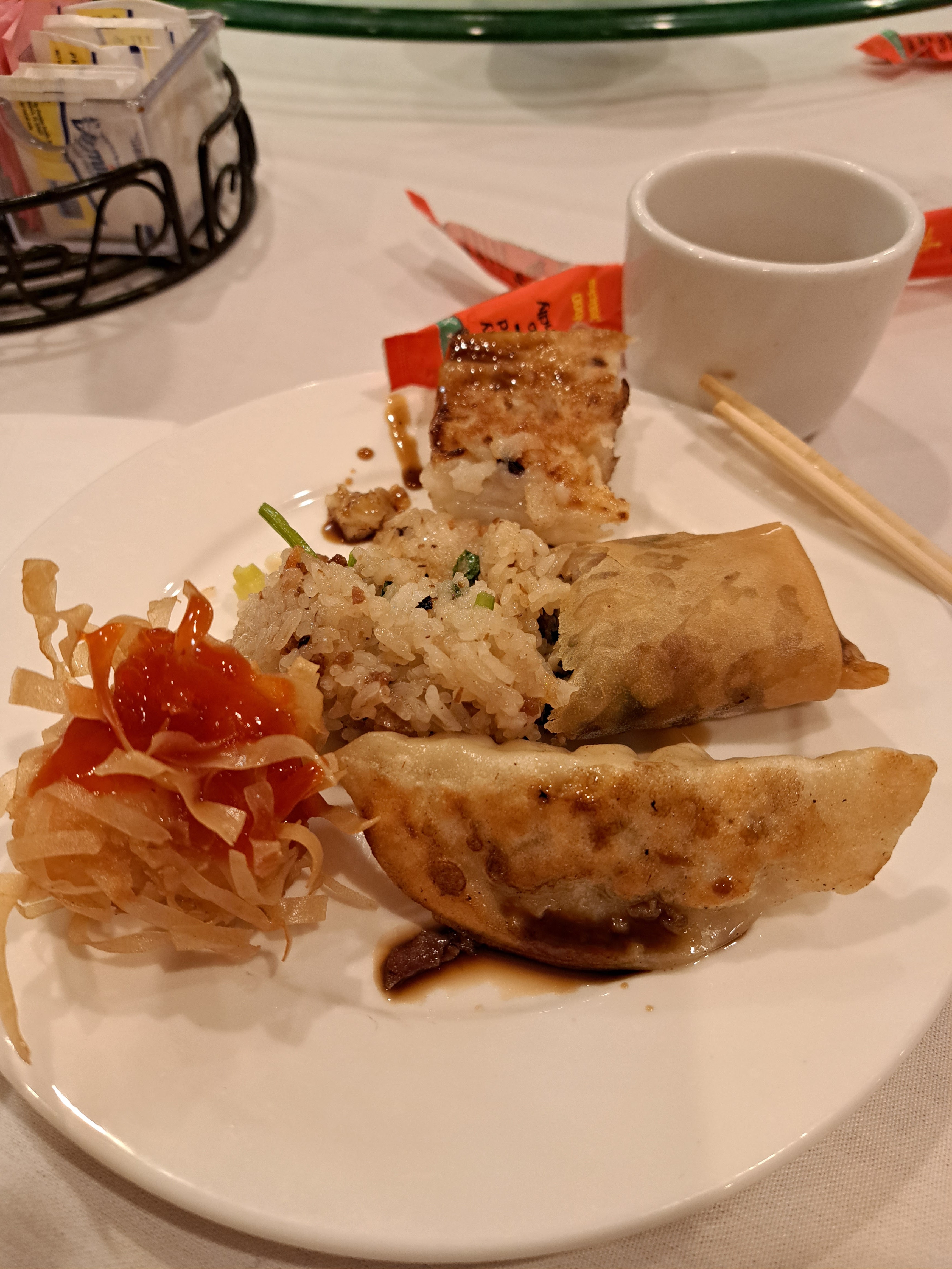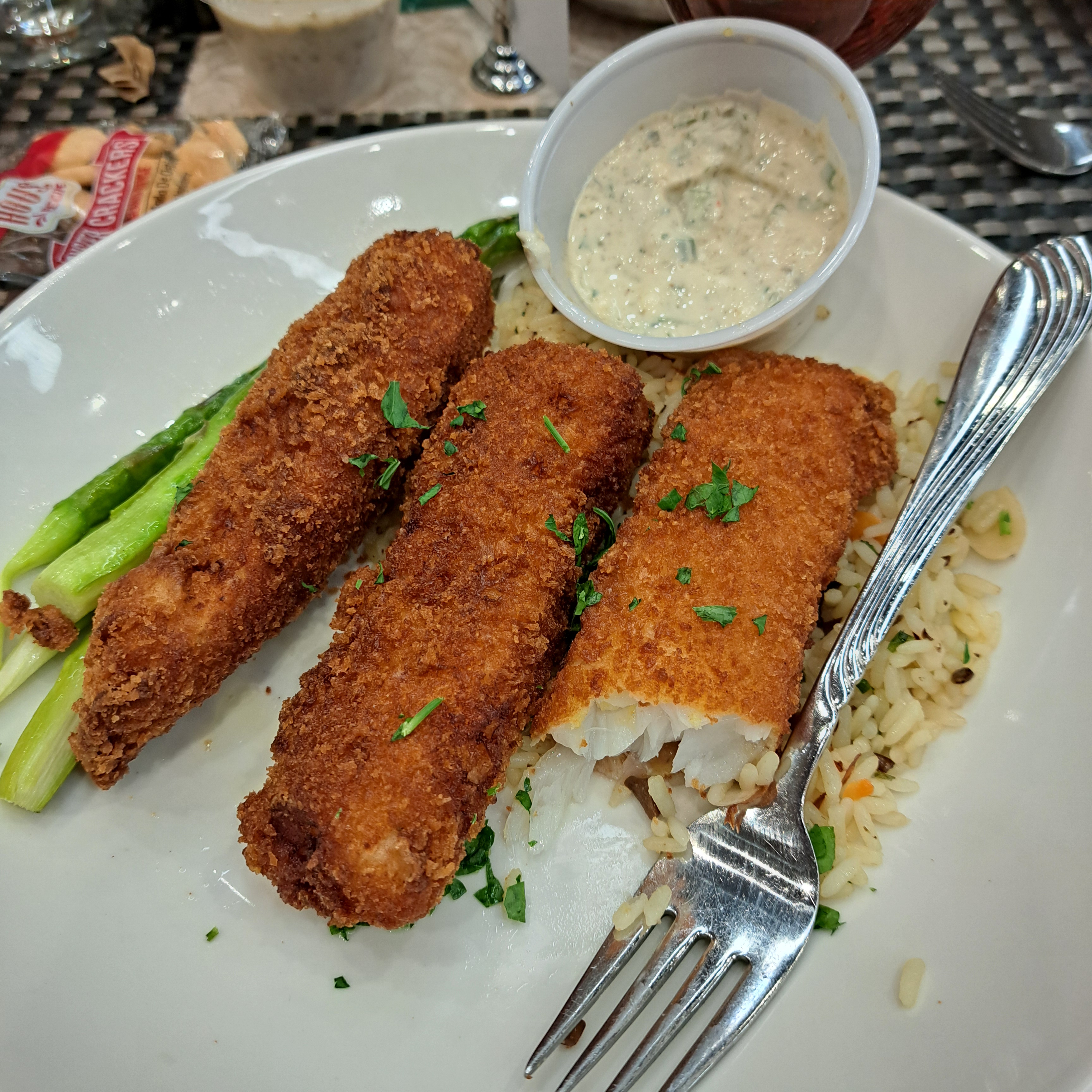 Most of us ordered the Crispy Beer Battered Cod while one of my friends had the pecan chicken salad, which she ended up taking most of home. The cod fillets were dipped in a house made beer batter then rolled in crispy Panko breadcrumbs. They were crisp and delightful. The fish is then fried and served with herb rice pilaf, fresh vegetables (today it was asparagus), a delightfully sweet vinegar coleslaw, and their house tartar sauce. The meal was delightful. The fish was crispy yet moist and tender inside. I always enjoy their rice pilaf, and I love asparagus and it was perfectly cooked. The coleslaw was also a nice surprise. I usually don’t like vinegar-based coleslaw, but this one was tasty and well-seasoned. I ended up bringing one of the three fillets home with some rice and a couple of spears of asparagus. I’m looking forward to popping the fillet in a hot dog bun for a little snack over the weekend. We sat around talking until most of the place cleared out, knowing the kids would be heading out at the end of the school day. I paid using the QR Code on my bill, but my friends braved the long line.
