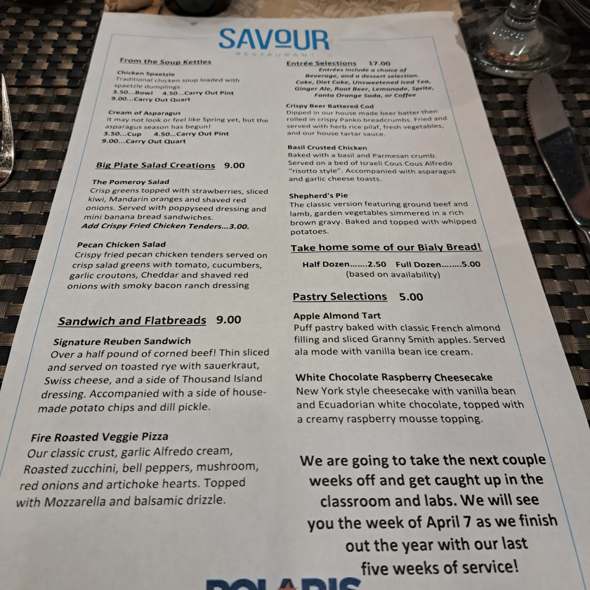Savour is the Career Center’s restaurant for high school students. It is open for lunch from 11:45 am – 1:00 pm on Wednesday – Friday (most weeks except when school is not in session) in September-May. You need to make a reservation. We had a noon reservation, and the place was so packed that they sat us at a folding card table, knowing we are regulars and would not mind. There was a bus or two of senior citizens here that day. We didn’t mind at all, being not quite senior citizens, but my friends are retired (I delivered a translation and ran a bit late today). We eat here a lot when we can, because the food is delicious and very affordable.