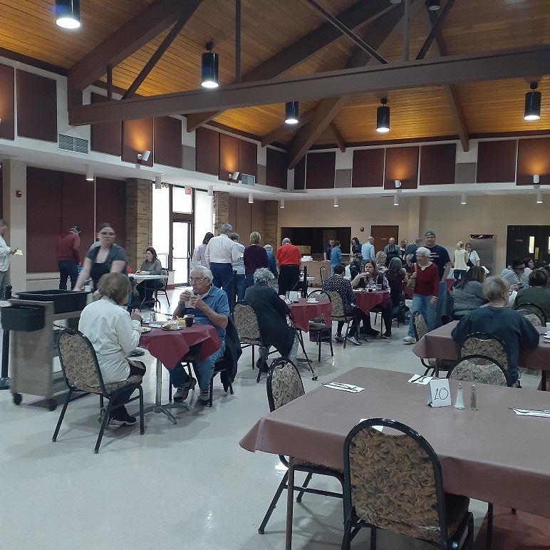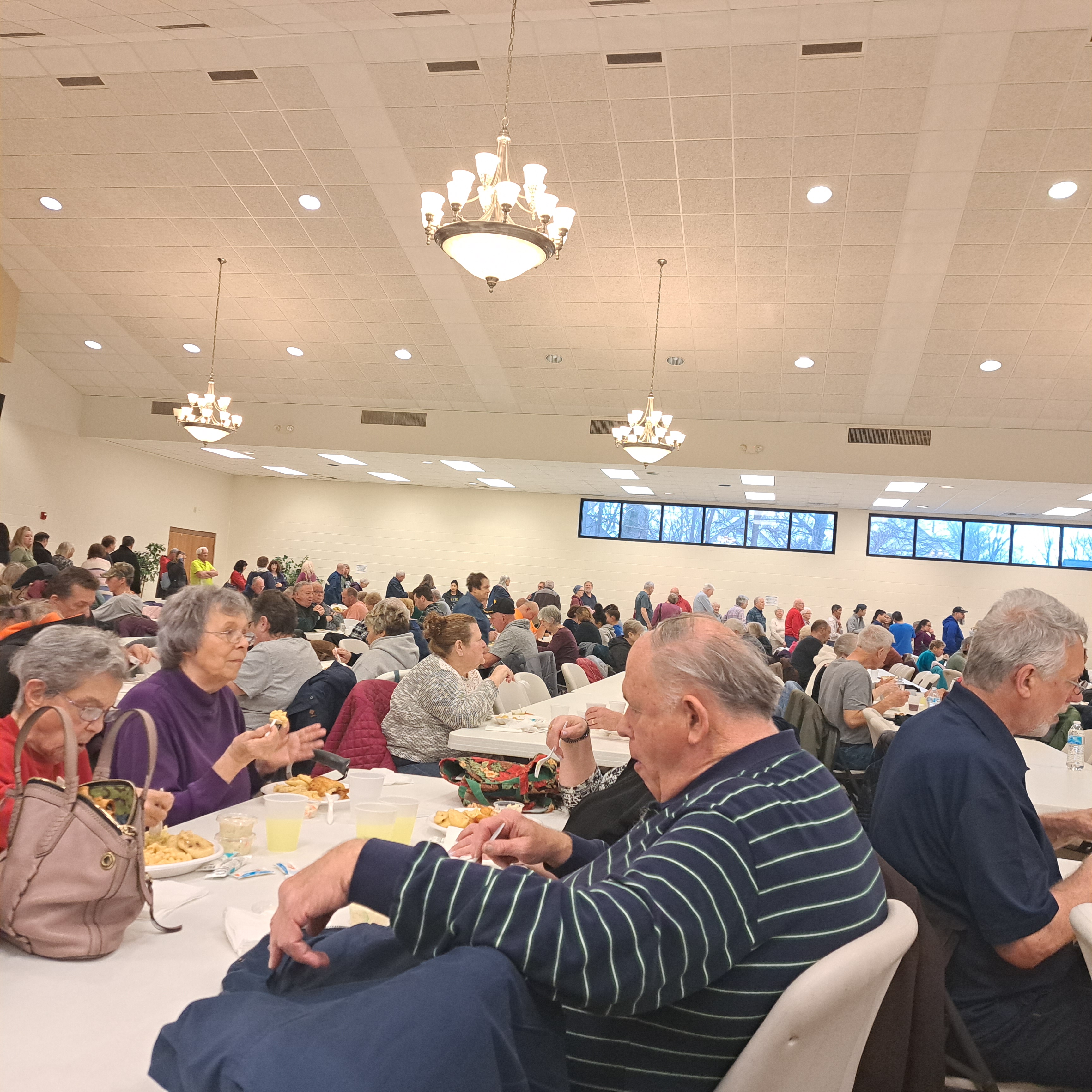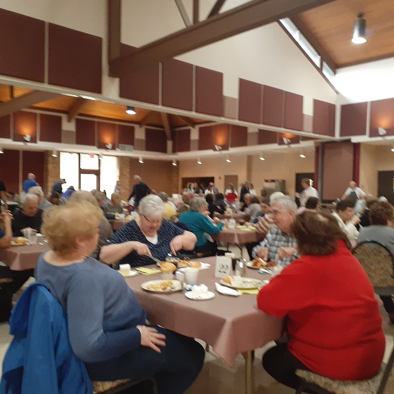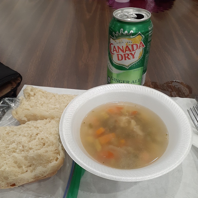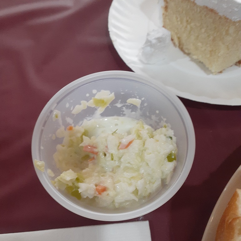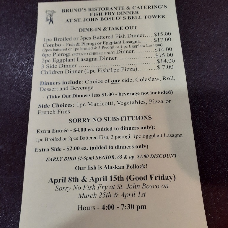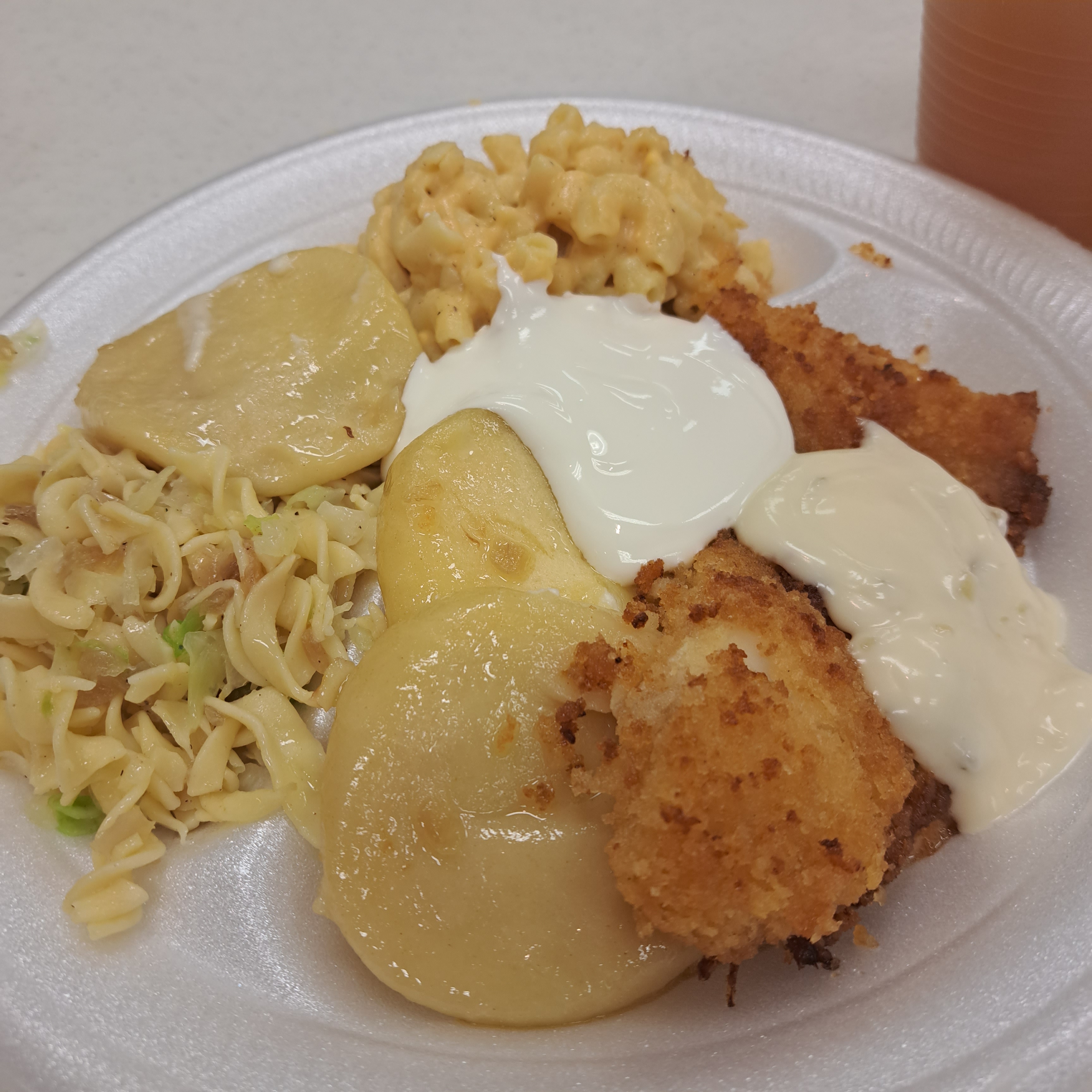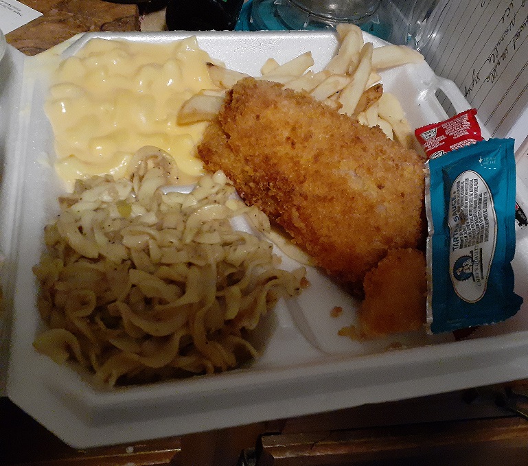 I headed to the Take Out sign thinking the line was for take out, but initially was in the line on the left wall that was for dine in (they serve the dinners on trays through a serving window – runners can help carry your tray if needed). I then headed towards the bar area (behind the crowd of people to the right of the big Take Out sign) to get in what I thought was the line, but it turns out it was just people standing around waiting for their take out meals. We were also obstructing the bar/beverage traffic, so that was fun. You actually need to order from the ladies sitting down at a table behind the dine-in condiments table (in the middle of the photo). Obviously you need to bring cash – no credit cards here. They need to do something about the logistics because it was a mess. I then was finally able to order my fried fish dinner and a side of mac n cheese to go. As we stood around waiting, one woman’s order was misplaced (but not really – it was just waylaid in the kitchen, but she quickly made a stink after her friend’s meal came up), and while they were trying to find it some other dinners were still coming out and put on a table to be bagged up. One woman who ordered after me got her meal while mine sat on the table waiting to be bagged up for me. There isn’t much of a consistent system. But hey, it’s a church fish fry with volunteers. After another minute or so I grabbed my bag and headed back to my car for a quick drive home.