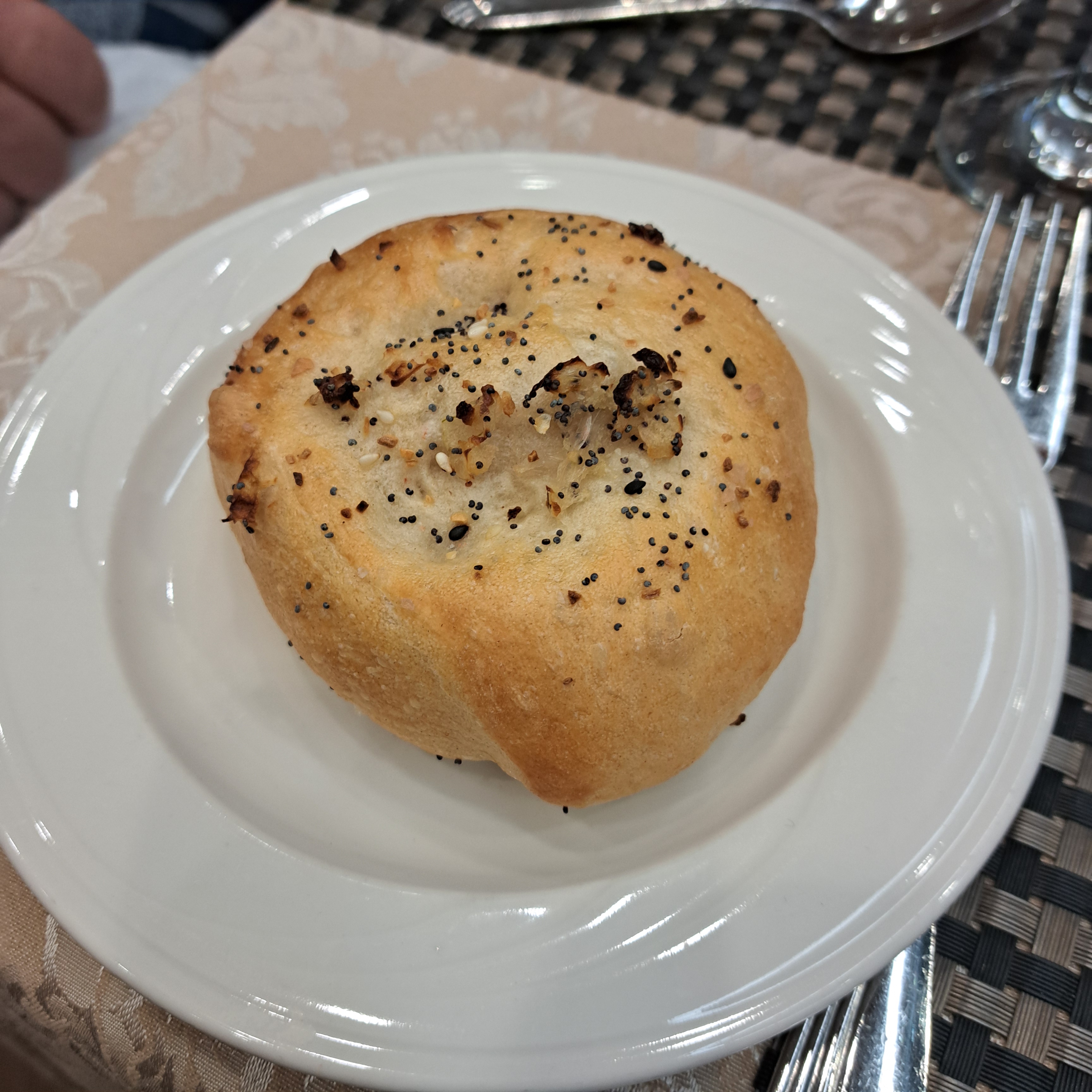 Our server was competent and very friendly (it can sometimes be hit or miss), and we got a couple of extra bialy as a thank you for being accommodating. The bialys are always a highlight. The chef changes the menu every week. In addition to several two soups, two salads, a pizza or flatbread and a Reuben sandwich. They also offer three prix fixe meals that include a bialy, a beverage, an entree and a dessert. This week they had Crispy Beer Battered Cod with herb rice pilaf, Basil Chicken over cous cous or Shepherd’s Pie (with ground beef and lamb).