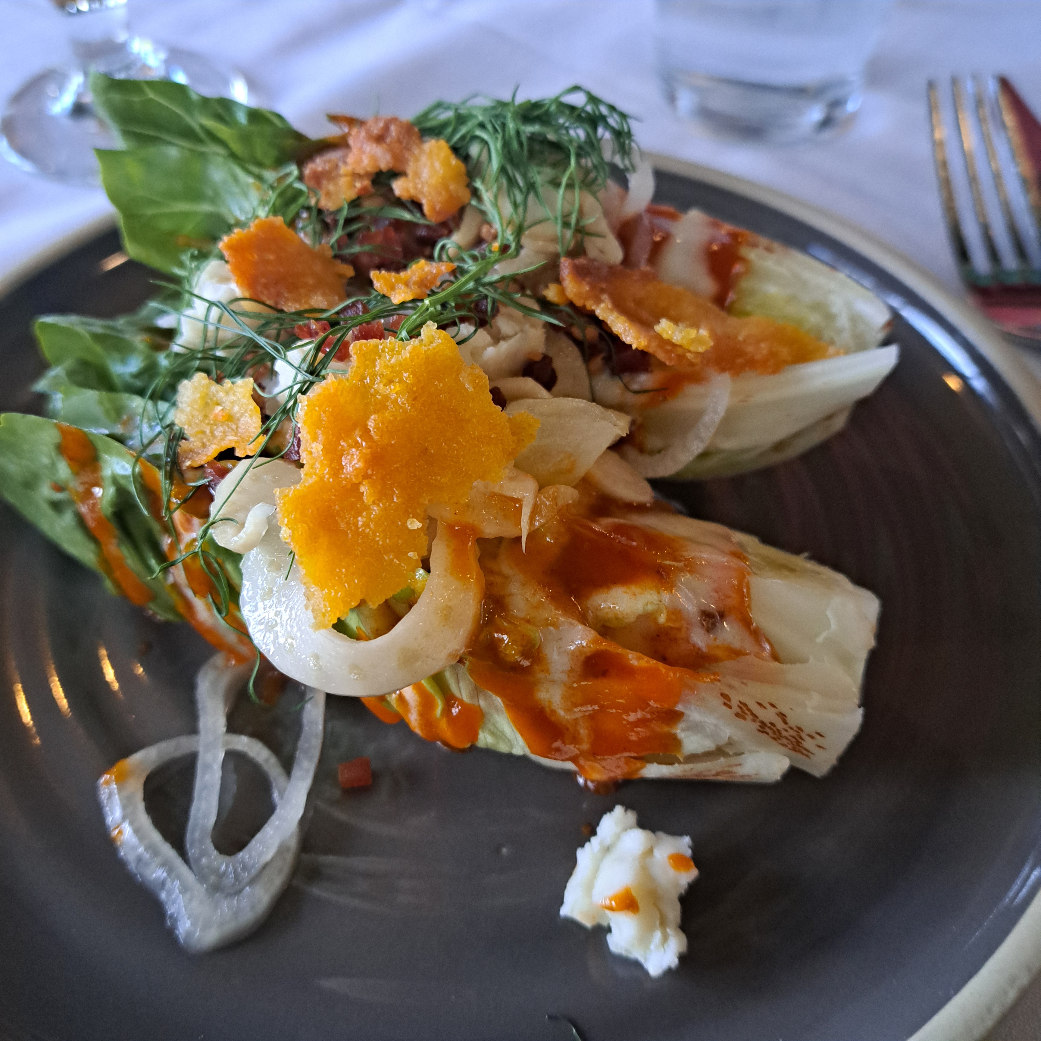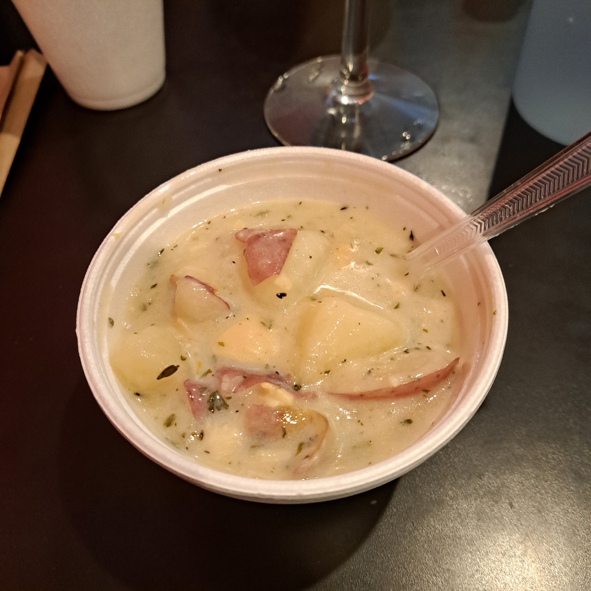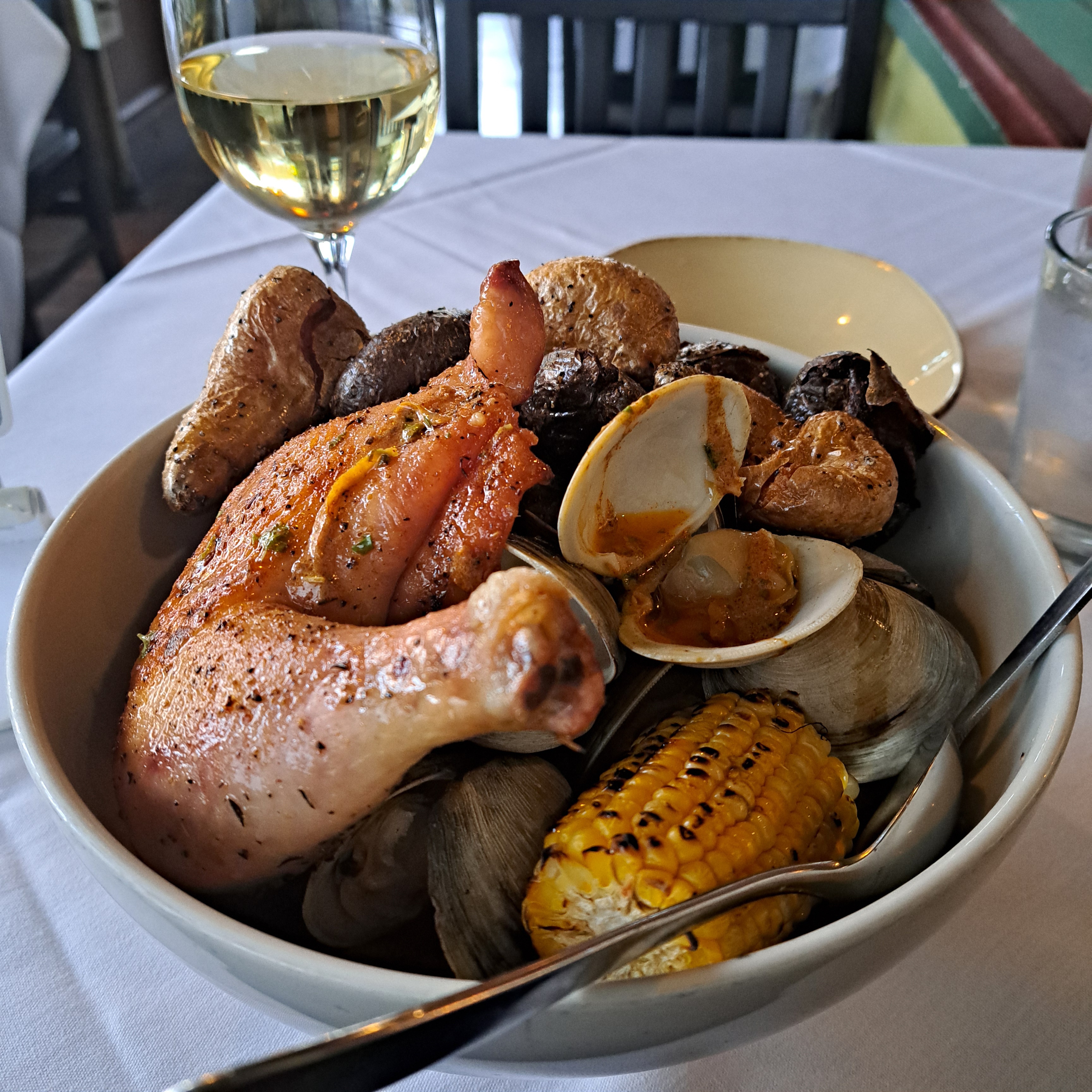 I decided to stay closer to home for the next clambake, deciding to try Poppy on Larchmere. I had been there when it was Felice, but hadn’t been to Poppy yet. Since it is run by the women behind Salt+ (RIP) I knew I would be in good hands. Poppy serves its clambake special every Friday through November 14. I arrived shortly after they opened at 5 without a reservation, but they were able to accommodate me on the large converted front porch (and the early arrival ensured street parking close to the restaurant). The hostess and my server were both lovely. I was given a carafe of water, which I appreciated. I tend to drink several glasses of water when I’m out to dinner. I ordered the PCP, which is made with Bacardi dark rum, pumpkin spice syrup, coconut cream and tropical juice. It was a nice start. The clambake came with the choice of clam chowder or a wedge salad. Since I love both and couldn’t decide, I ordered both and had her add it to the bill. The clam chowder was phenomenal. It was a small portion, but I enjoyed every spoonful. The wedge was not the typical wedge salad. It features romaine instead of iceberg. The salad came as two baby romaine wedges topped with crispy pancetta, polenta crisps, shallot fennel relish, buttermilk and french vinaigrettes & gorgonzola. It was quite tasty. I’m not quite sure what to say about the clambake. It came served in a big bowl holding a dozen clams, a quarter roasted chicken, a small grilled corn on the cob, and crispy fingerling potatoes. The broth was red in color, and I suspect it had harissa in it due to the color and kick of spice. When my server asked, the kitchen said they used Old Bay. I’m not a huge fan of chicken quarters (as you can see from the other choices on this page), and I missed the drawn butter of it all. The fingerling potatoes, on the other hand, were great – crispy and nicely salted. I’m glad I tried it, but I don’t know if I will put it on my clambake rotation. I’ll probably be back to try some other things at Poppy since it is so close. Because I ordered a cocktail, a glass of wine and an extra starter, my bill was around $74.50, making it the priciest clambake this season.