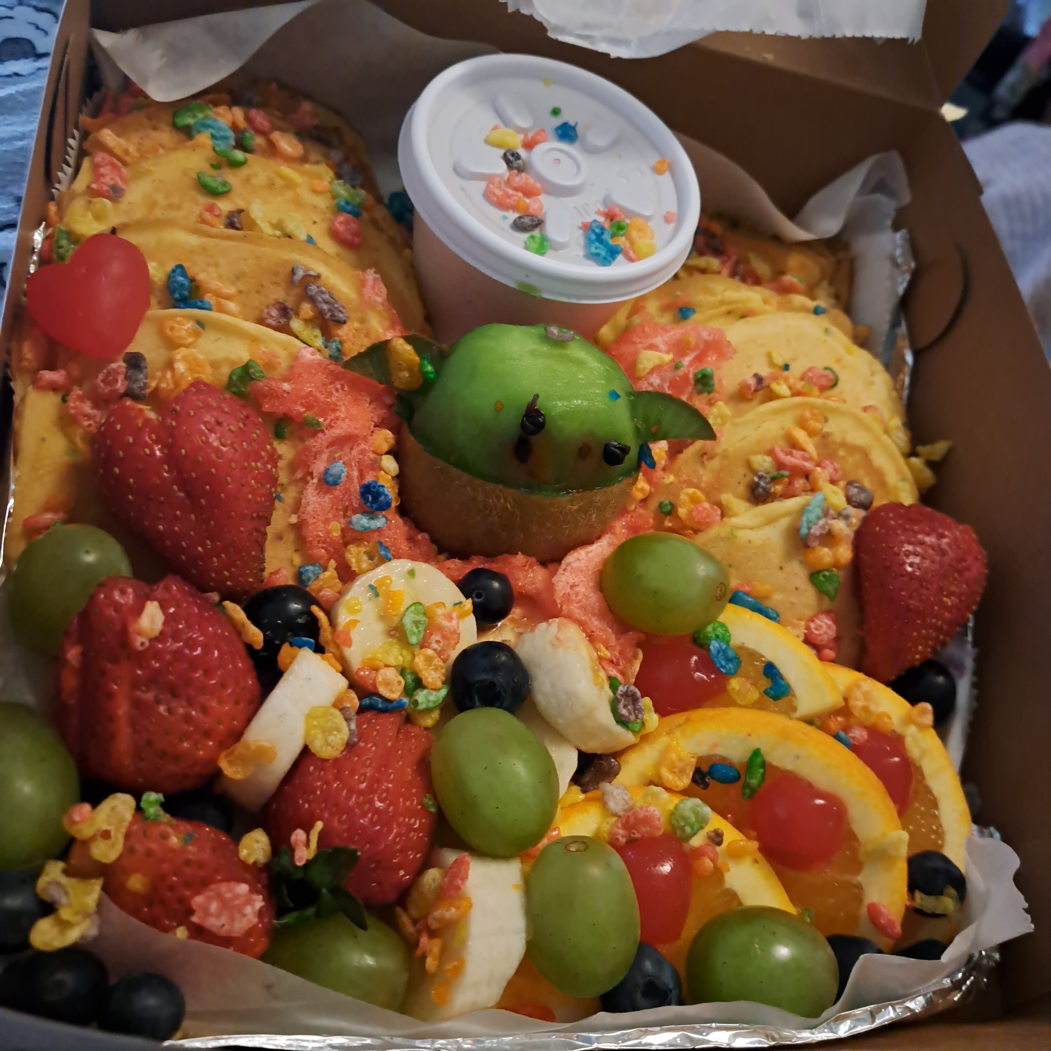 Speaking of health, I scheduled a colonoscopy on Valentine’s Day (and the day after the Super Bowl). No food gluttony for me 😦 ! I prepped with pho broth (I do not recommend it – my blood pressure was almost too high for the procedure). I know the first food after a colonoscopy tastes wonderful, but I treated myself to a special Tres Leches with Dulce de Leche pancakes and fruit platter from Sabor Miami Cafe and still think back on it fondly. The Tres Leches pancakes with Fruity Pebbles and fresh fruit (including a kiwi that looked like Baby Yoda) made me so happy! It was so good that I barely used the Dulce de Leche dip. Even though I was starving it took me a couple days to eat it all. And good news – I only had a couple of small, non-cancerous polyps and got a clean bill of health.