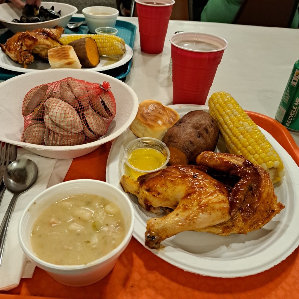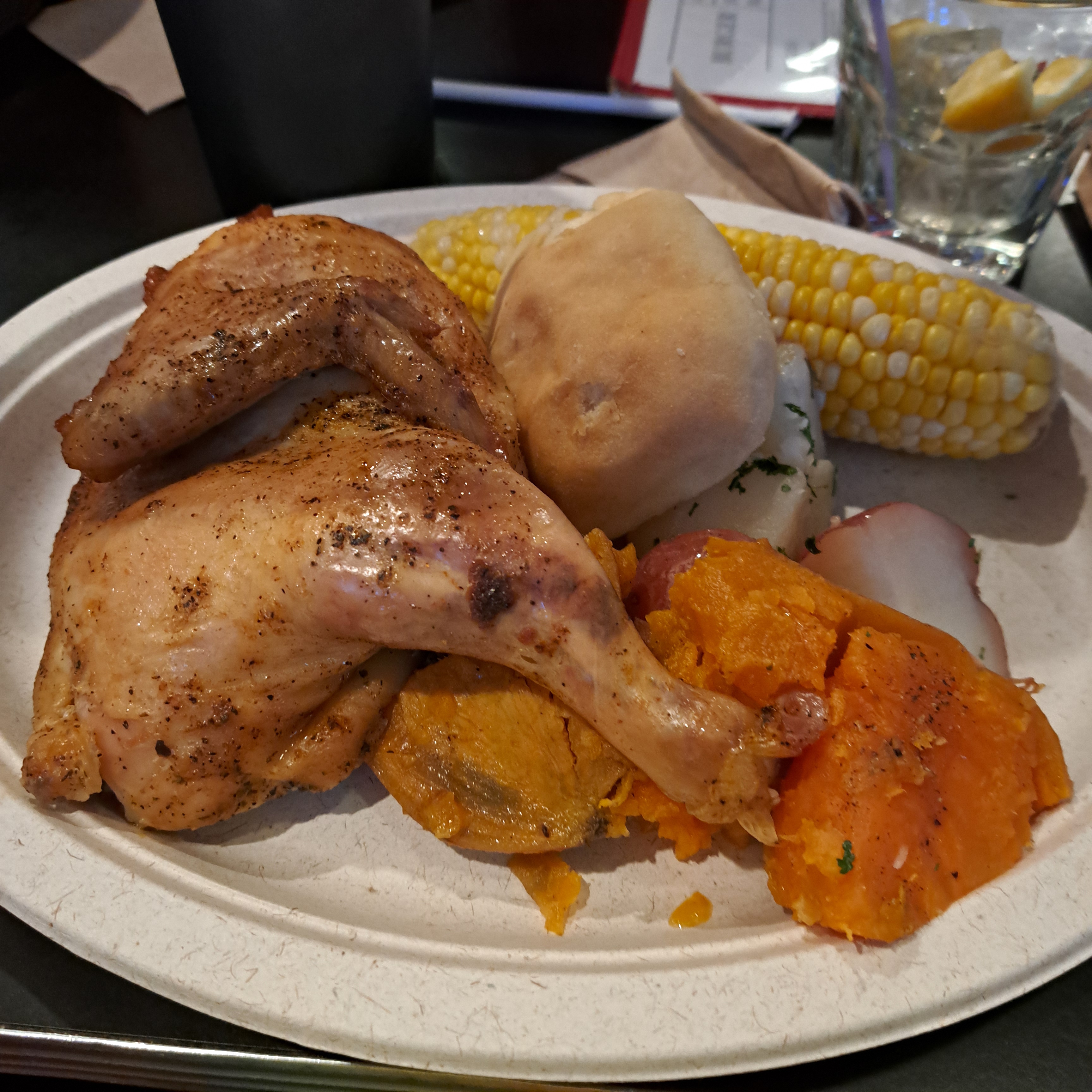 The clams were great – tender and not gritty. According to the Gunselman’s website, “the clams are sourced from Joe at Lobster Brothers in Westlake, who has a source in Narragansett Bay, RI, which is home to the finest clams in this part of the world.” The server happily got me a side of barbecue sauce for my roast chicken, and I happily enjoyed the clams, corn, the leg portion of my half chicken, the roll, and a couple bites of the redskin and sweet potatoes. I got a box for the breast portion of my chicken and the redskin and sweet potatoes.
