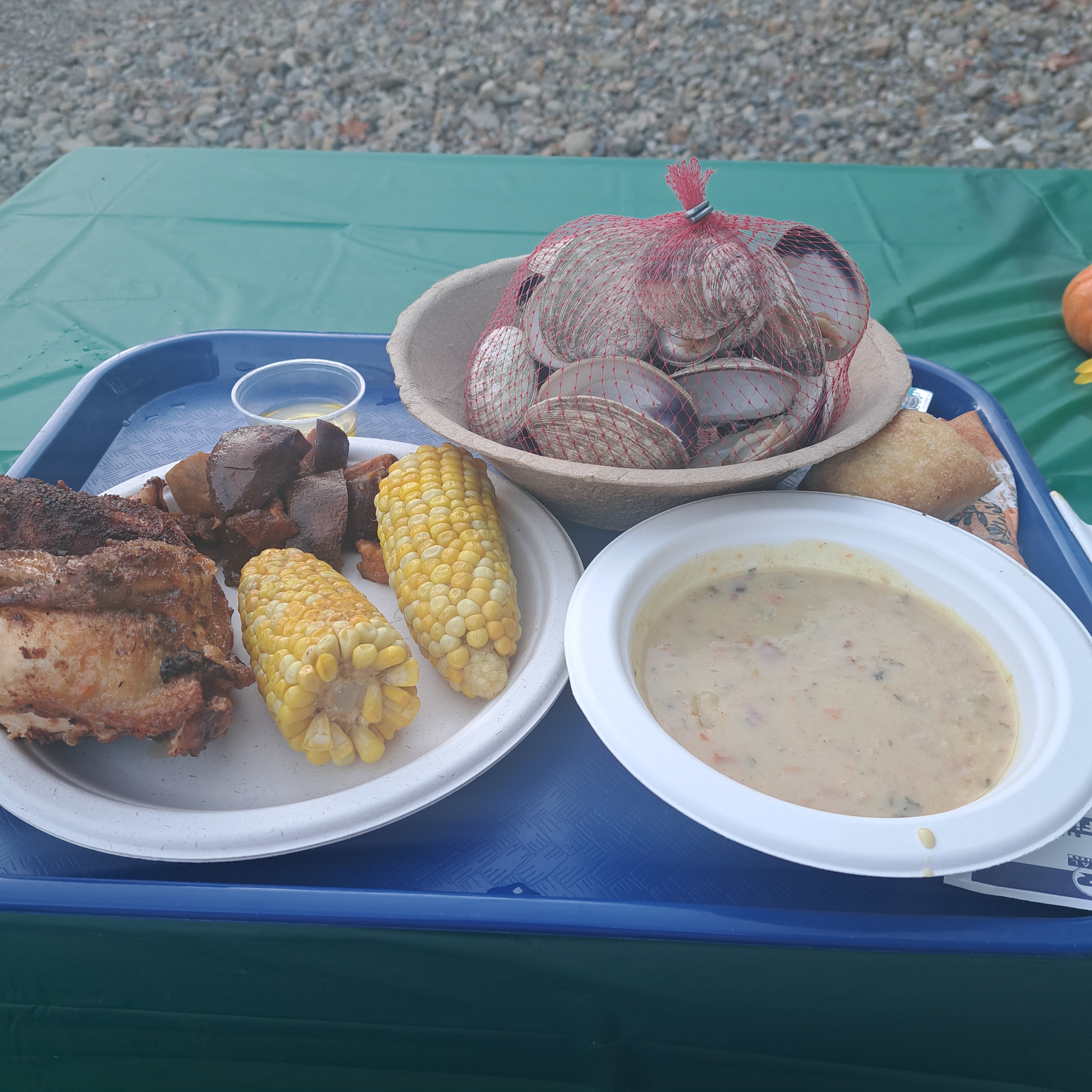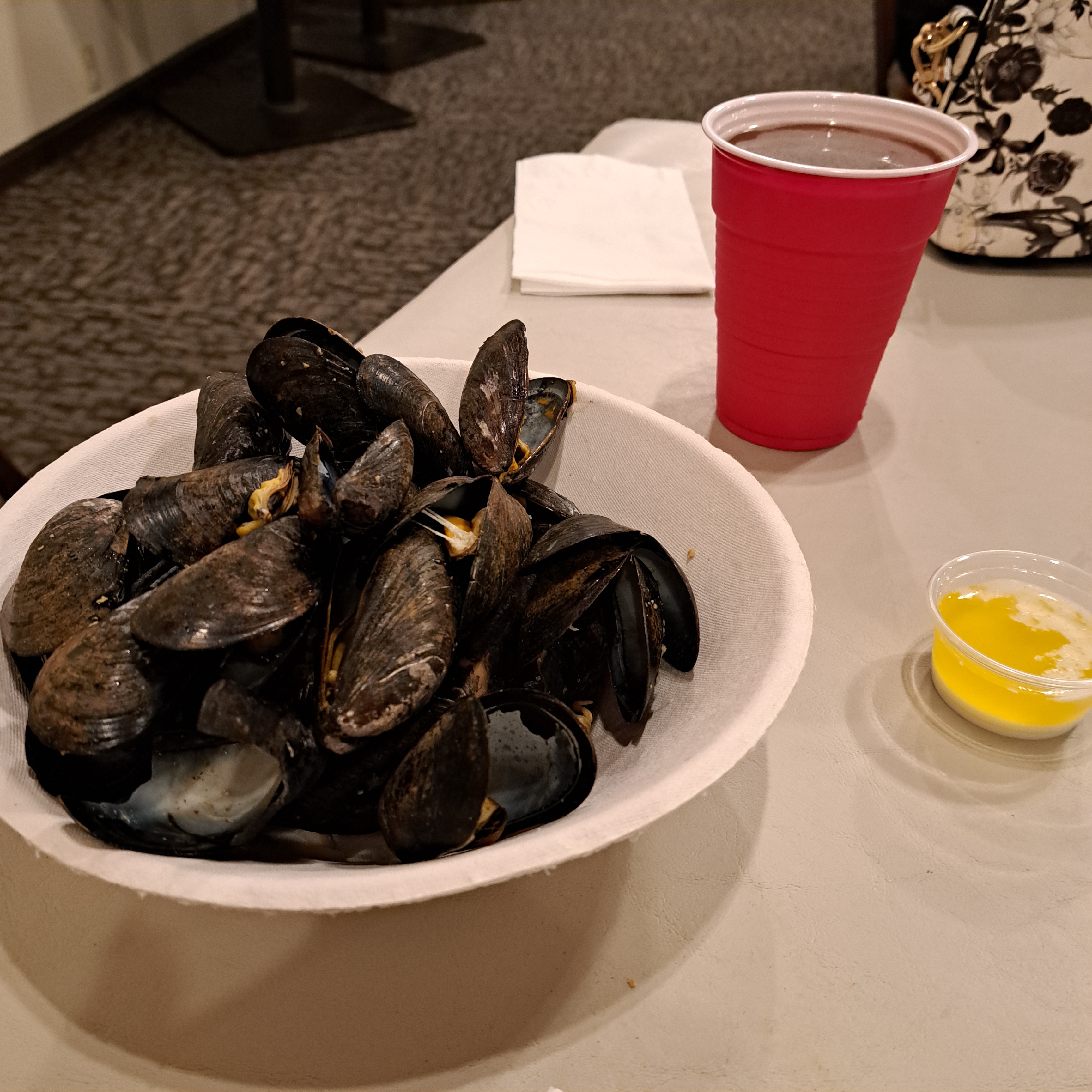 I once again attended the Willoughby Elks’ clambake with my friend, who is a member, on September 28th to kick off “clambake season.” I managed to get a really good parking space near the door and met my friend in the back where the clambakes were being prepared. Unlike last year, which was rainy, we had gorgeous weather. We grabbed a beer at the bar inside and grabbed a table. We then headed outside to line up at the tent as our meals were assembled. It was not as crowded as it has been in years past because they were doing a big clambake and fundraiser a few weeks later. But no crowd meant no line. We also met towards the tail end, so that might have also played a factor. The clambake includes clams (or mussels) with the choice of 1/2 a chicken or steak along with sweet potato, corn on the cob, coleslaw, and clam chowder. I had ordered a Chicken Bake this year, because I remembered enjoying the taste I had of my friend’s last year. I usually get a steak here. My friend ordered the mussels, while I had the clams. They grill the chicken and steak outside to order and then in my case slathered the chicken with a tasty barbecue sauce. After loading our trays with everything we headed inside where it was air conditioned. The chowder is usually a highlight, but maybe it had been sitting too long because it was pretty thick. And there were no butter issues this year (the rain had seeped through the tent last year). I once again enjoyed the clams and chowder and a few bites of chicken and brought home the rest of the chicken and the sweet potato for lunch the next day. Since it was towards the end of the clambake they were offering extra clams and mussels if people wanted them (we shared some mussels, as you can see below to the very right). Unfortunately they were somewhat overcooked and falling apart.