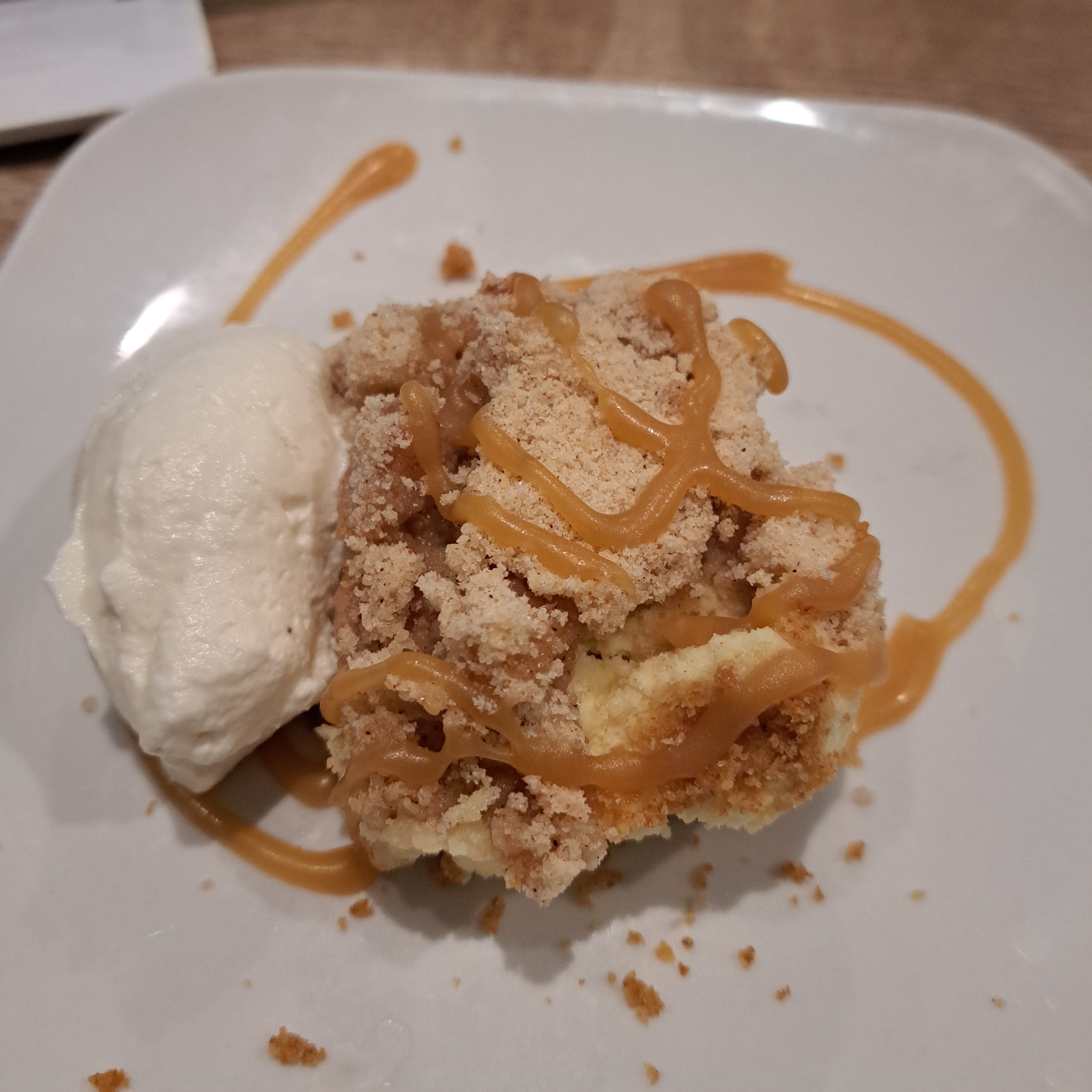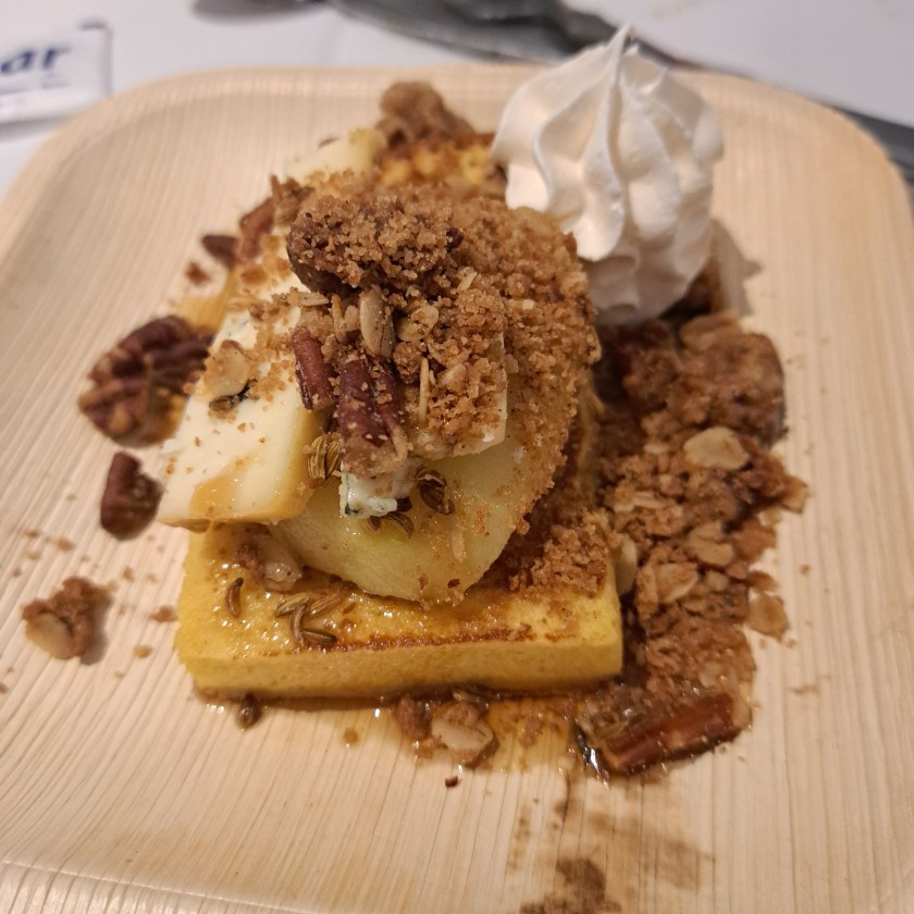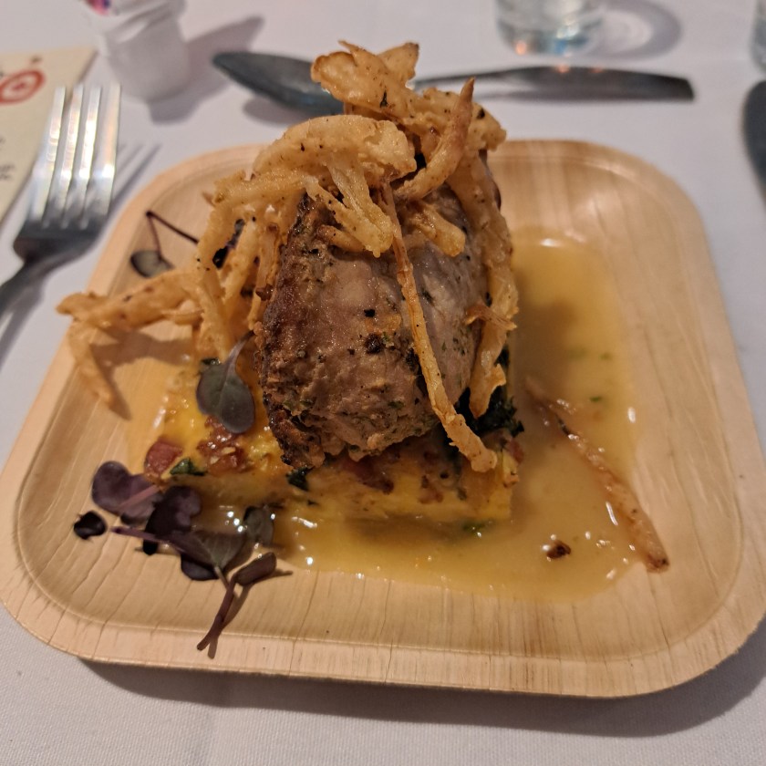 We weren’t sure what to expect with three entrees listed. Would they be served together on a plate or served individually? I was most looking forward to the roasted garlic and herb pork tenderloin, which ended up being the first entree served despite being second on the menu. It did not disappoint! The “spinach, bacon and apple bread pudding” was a fantastic complement to the pork, which was perfectly cooked. It was topped with a delectable cider and maple butter sauce and crispy fried onions. I’m glad they served it first because I still had room to enjoy every single bite of it. I picked a bit at the next entrees, and one of my fellow diners asked for a box for hers. There was not a single thing on the plate I did not enjoy. I would go to a restaurant to order it!
