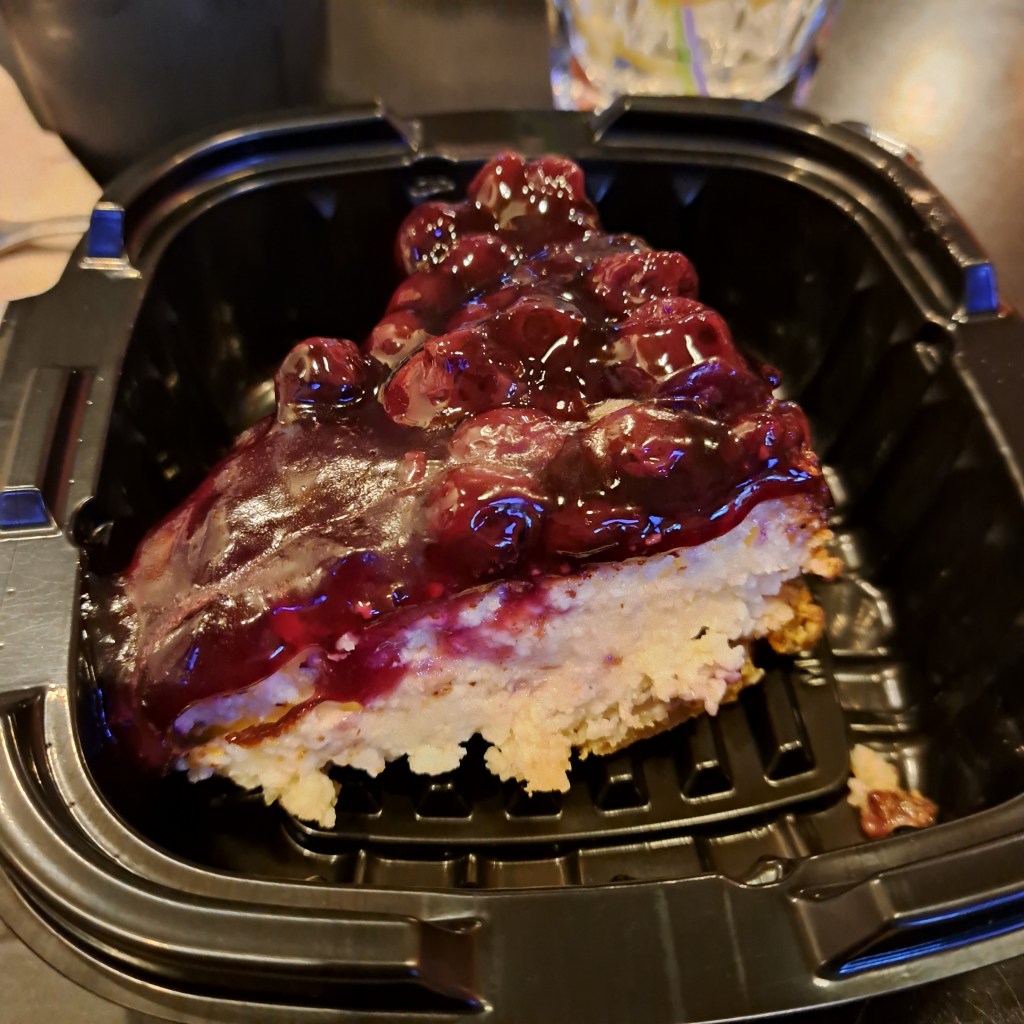 Several of us also ordered cheesecake – mostly to go. One of the servers proudly told us she had made blueberry and cherry cheesecake. When I ordered I told the server that I didn’t care which one she brought and to just bring me a slice of the one they had more of left. She brought me a slice of the blueberry cheesecake, and it was really nice (I had a bite of mine from the carryout box).