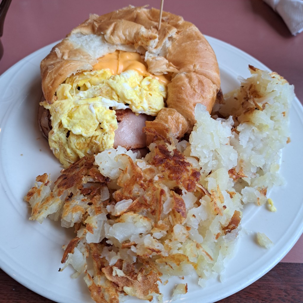The first time I went I ordered the croissant breakfast sandwich because I was craving one after enjoying a perfect croissant breakfast sandwich at Goldie’s in Strongsville. The croissant sandwich at Gus’s was also quite good and very generous. It came with a side of hash browns, which I needed to add salt and pepper to (probably kept under seasoned so that diners can doctor it up as they need/want). The croissant sandwich is made with scrambled eggs, cheese and your choice of bacon, sausage or ham (there is an upcharge for sausage patties or turkey sausage patties). I went with ham to replicate the one at Goldie’s. You can also get a breakfast sandwich on an English muffin or toast.