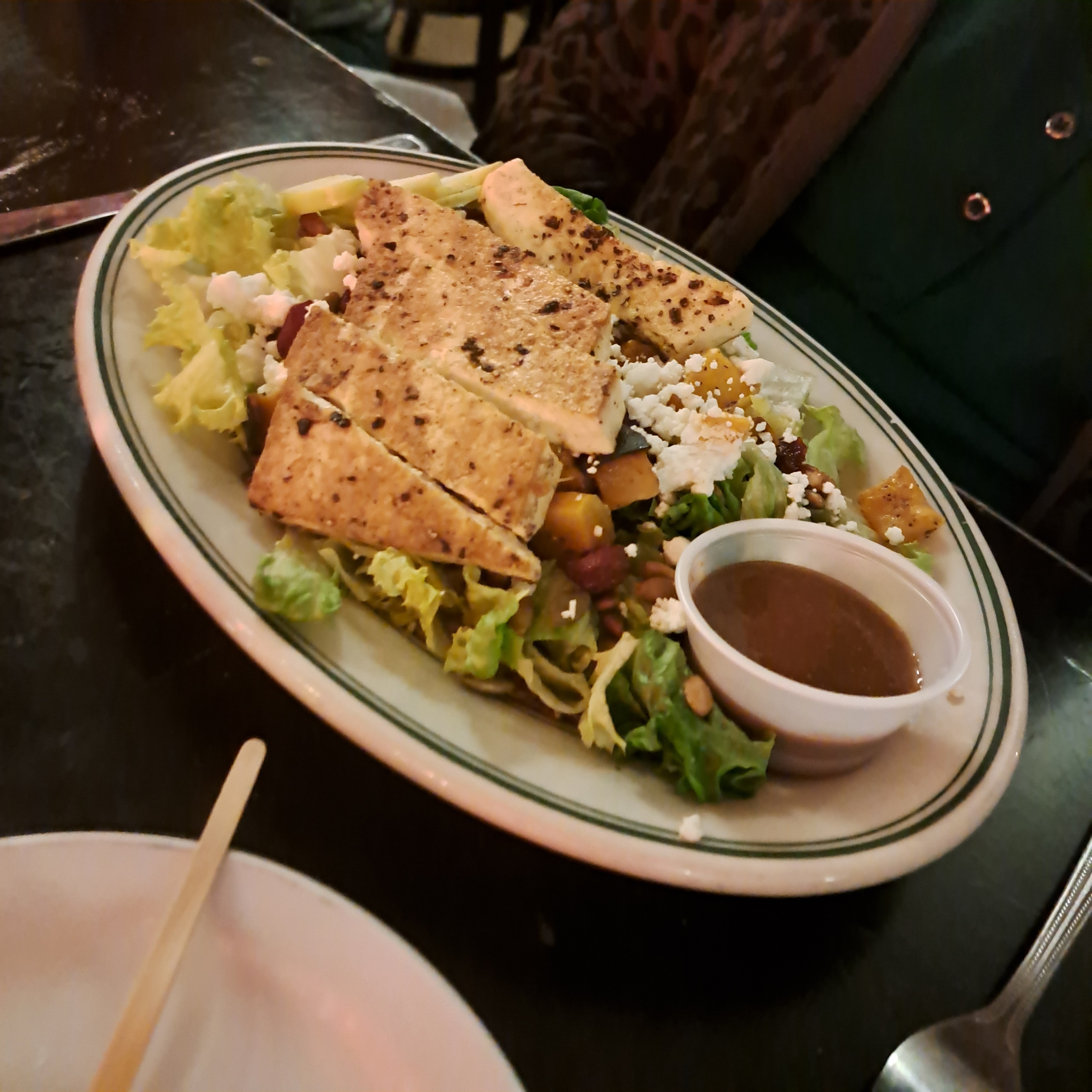 My friends also really enjoyed their meals – although one friend complained about the lack of chicken in the Chicken Paprikash (see center photo) and was given a small bowl of it in response. My vegetarian friend really enjoyed her Harvest Salad (with tofu – see the photo on the right) and was pleased by how low her bill was. The photo on the left is the Stuffed Cabbage.